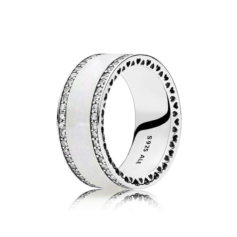 Ousado, clássico e contemporâneo, este anel de prata esterlina de banda larga é uma declaração de feminilidade e confiança. Pedras cintilantes delineiam o acabamento esmaltado rosa suave e marcante.