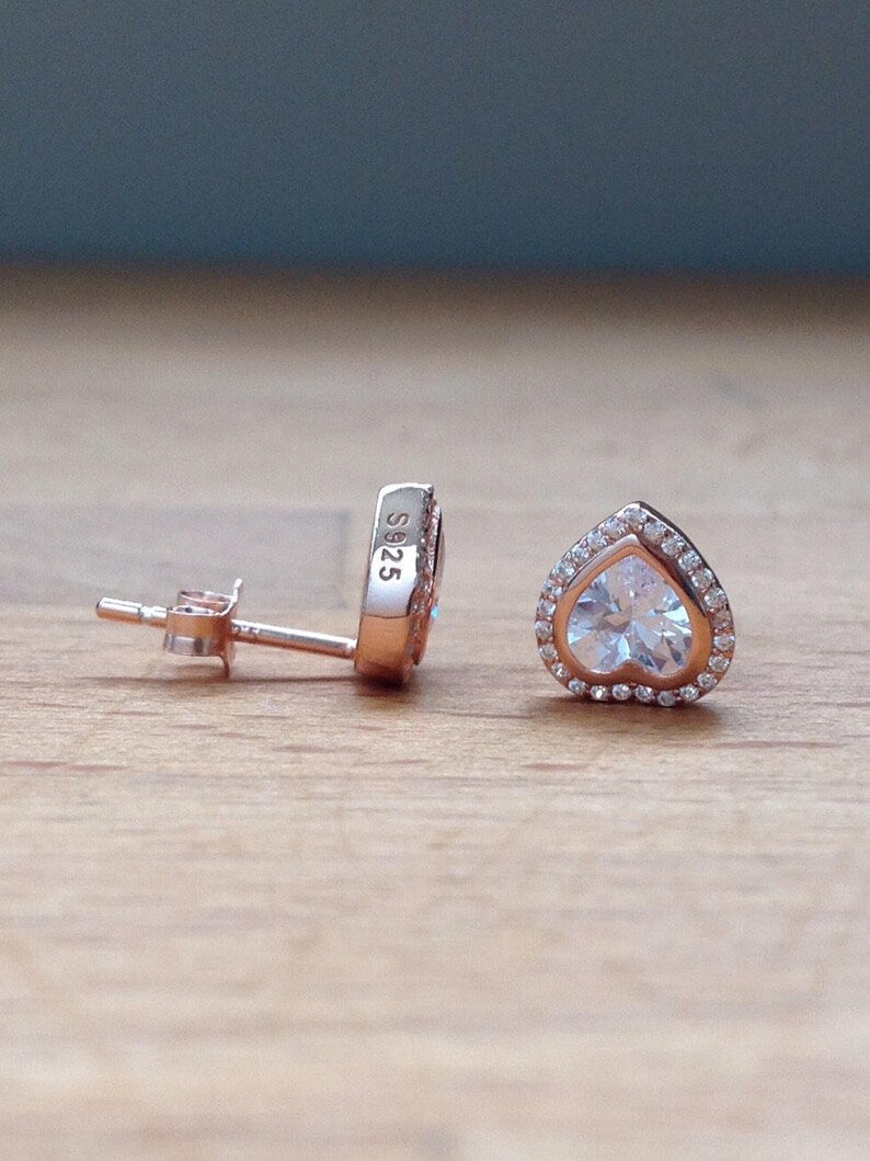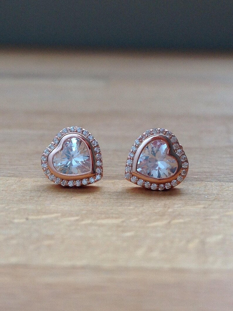 Um adorável brinco em prata 925 criado com corações em uma cor blush, adornados por zircônias transparentes.