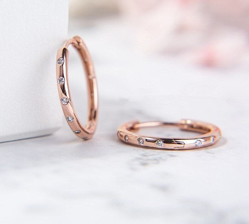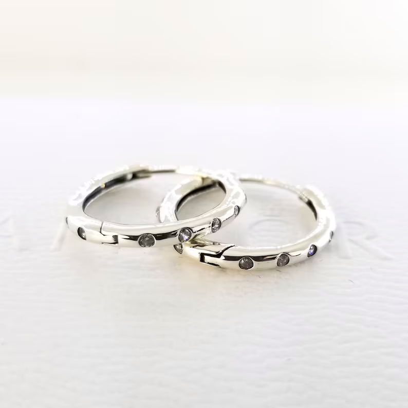 Enriqueça seu look do dia a dia com estes esplêndidos brincos de argola. Feitos com Prata 925 e cravados com pedras transparentes reluzentes, eles são a máxima expressão da elegância feminina. Brincos de argola em prata 925 com 24 zircônias cúbicas transparentes com cravação inglesinha.