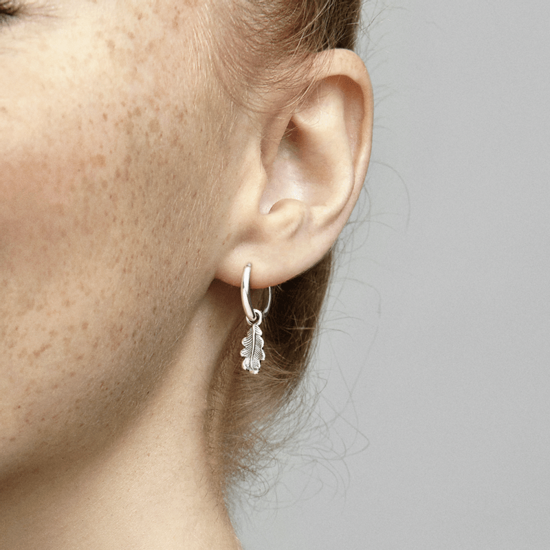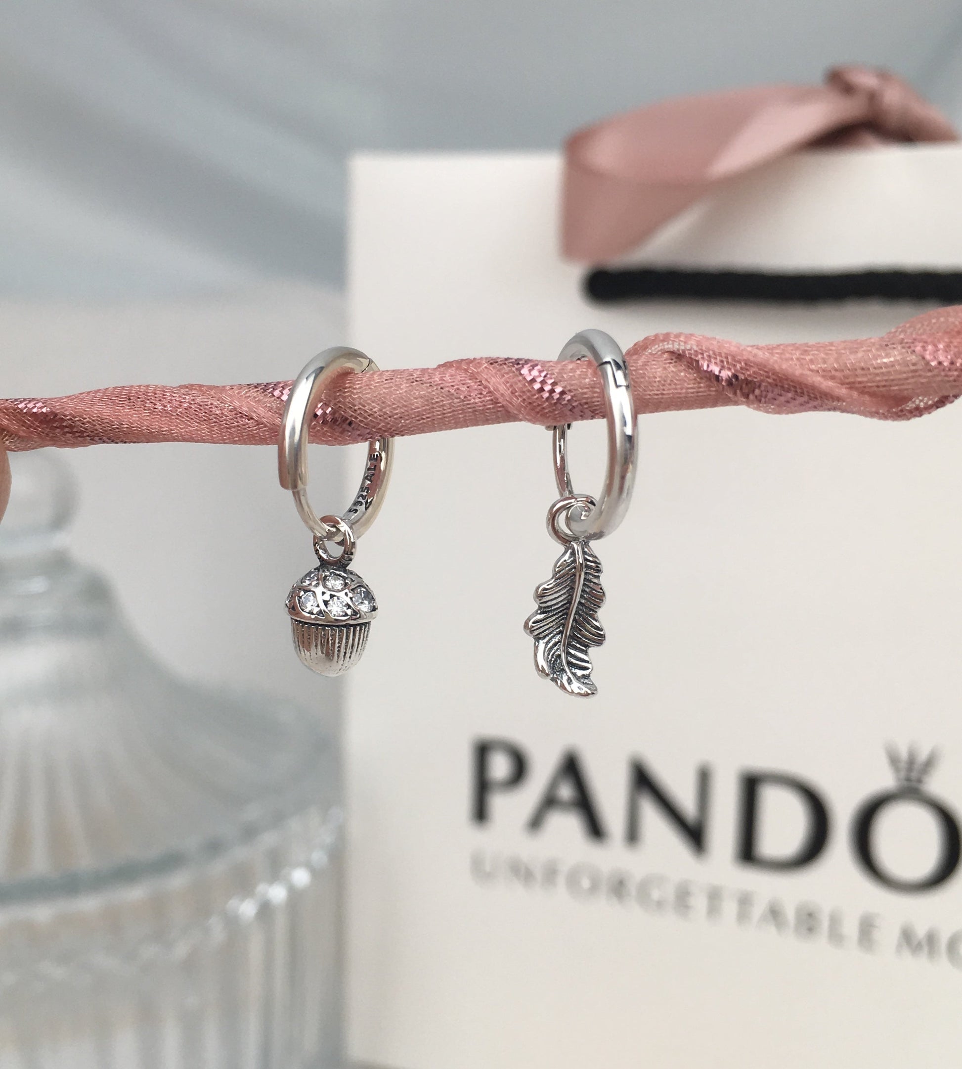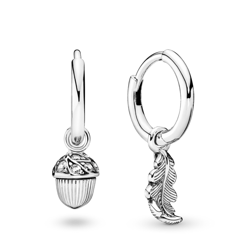 Elementos de uma floresta outonal. Pedras cintilantes na parte superior da noz e linhas texturizadas na noz e na folha. Brincos de argola com charms pendentes removíveis.