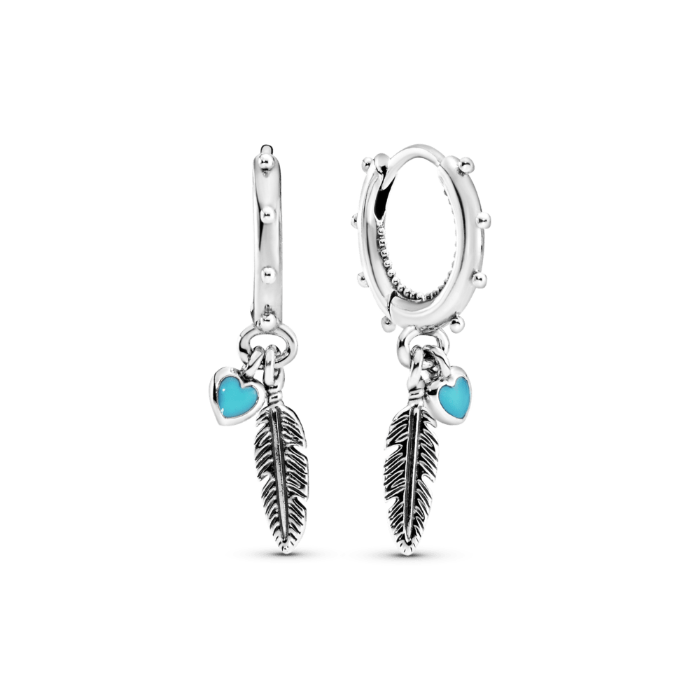 Aposte no estilo boêmio e nas penas com estes brincos de argola refinados, decorados com penas em miniatura e corações pintados em esmalte turquesa. Use-os em pares ou combine-os com outras peças de joalheria para criar um visual baseado nas coisas que você ama.