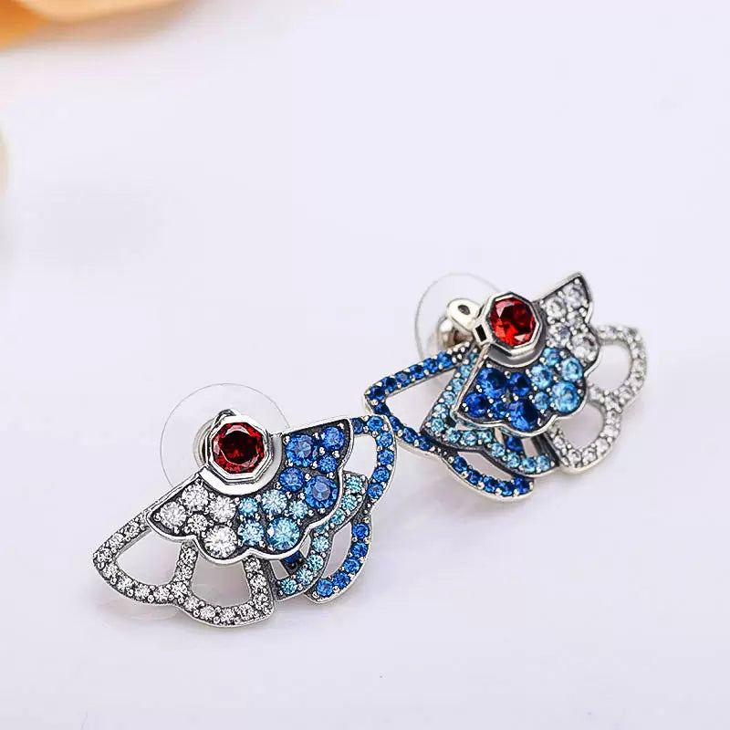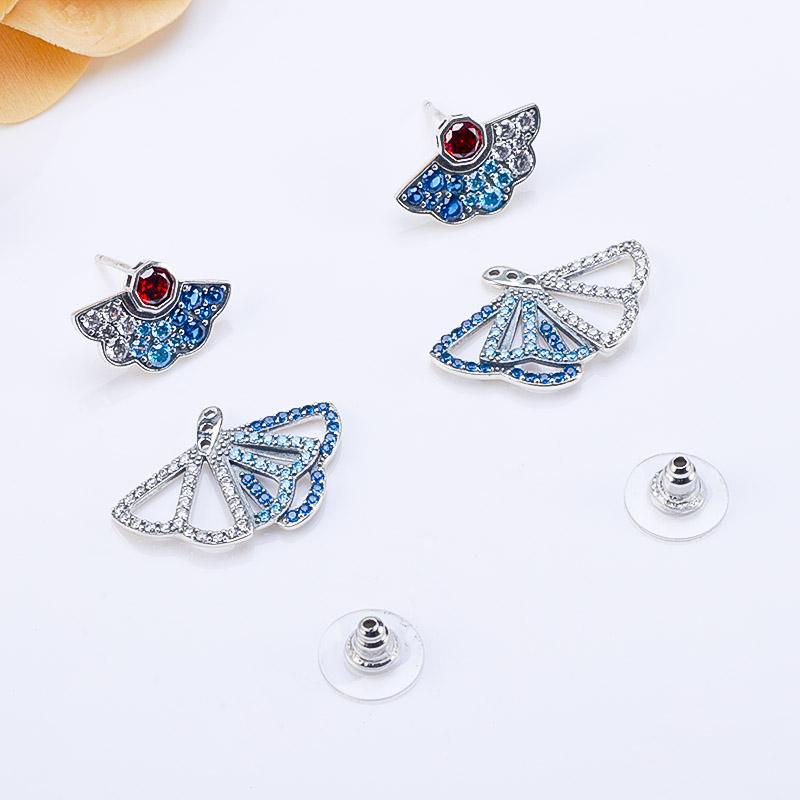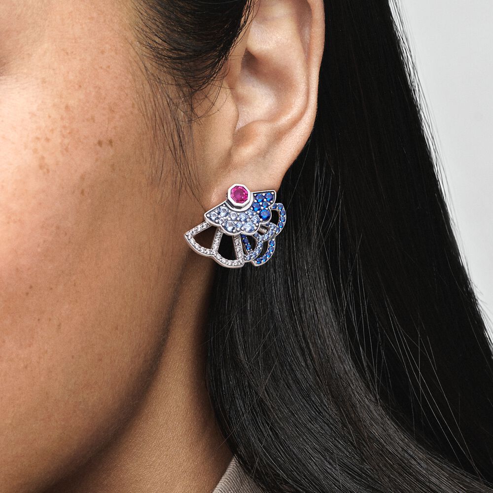 Adicione brilho ao seu visual com estes brincos azuis e rosa. Acabados à mão em prata 925, esses brincos giram em torno do leque tradicional, com um design de jaqueta de brinco que pode ser separado e usado sem a peça maior de fundo vazado, tornando-os um ponto de discussão versátil. Eles apresentam um acabamento ombré cintilante com zircônias cúbicas claras, zircônias cúbicas azuis extravagantes e cristais azuis verdadeiros. O design é inspirado no simbolismo dos fãs tradicionais do Extremo Oriente, significando poder, amor e status.