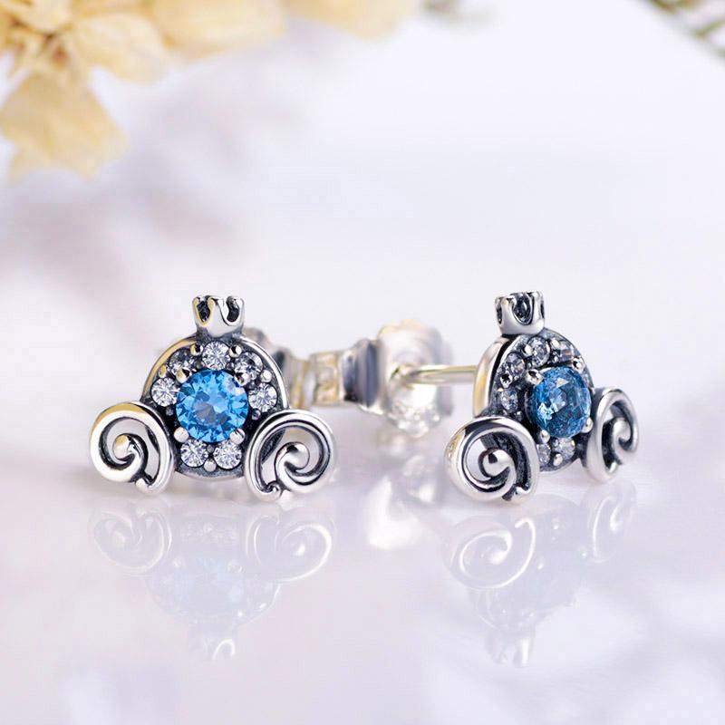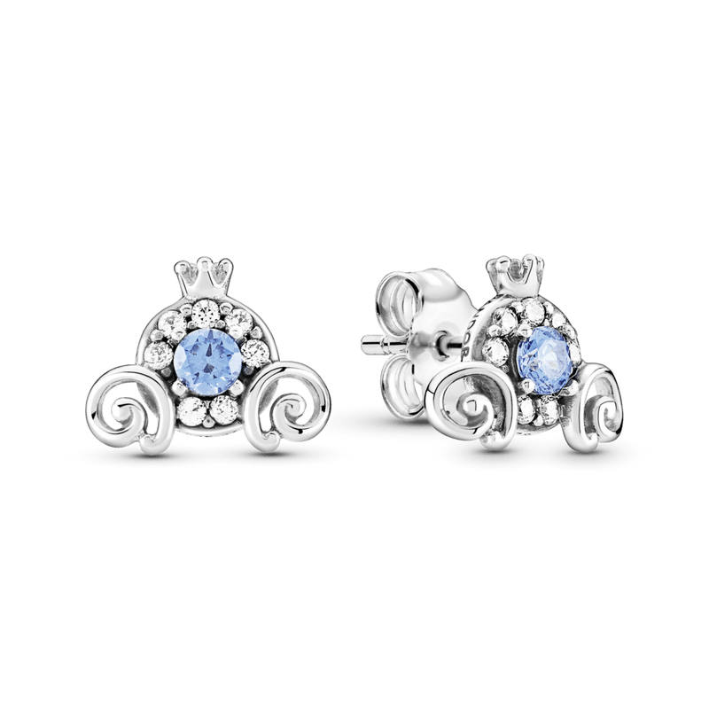 Faça uma declaração com estes Brincos Carruagem Cinderela . Projetados para comemorar o 70º aniversário da Cinderela, esses brincos são acabados à mão em prata de lei. Com a forma de sua carruagem de abóbora, cada brinco apresenta uma pedra azul rodeada por um halo de zircônia cúbica transparente com uma coroa 3D no topo e detalhes de folhas em espiral para as rodas.