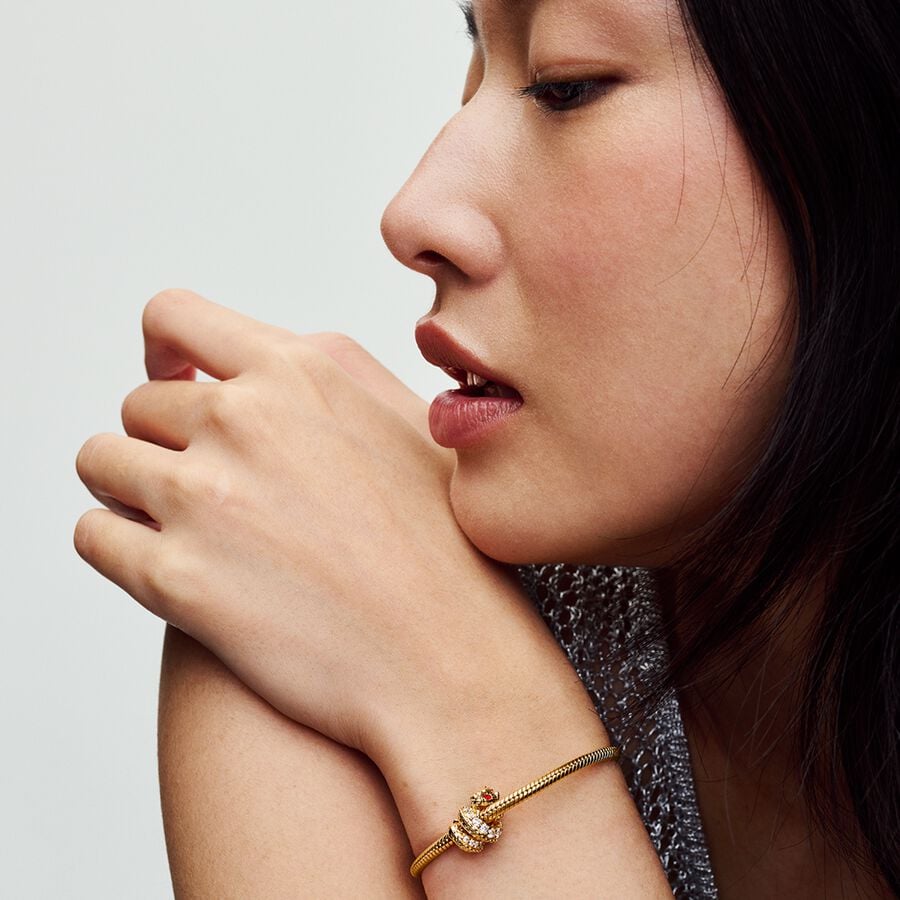 Convide boa sorte no próximo ano com o Charm Ano Chinês do Encanto do Dragão. 2024 é o Ano do Dragão - o 5º animal do zodíaco chinês, esta criatura mítica representa boa sorte, força, poder, sabedoria e saúde. Este charme banhado a ouro de 14k apresenta um dragão intrincadamente detalhado com uma fileira de pavê ao longo de um lado de seu corpo e detalhes de escala no outro. Pedras vermelhas cintilantes em forma de pera dão vida aos olhos do dragão, e seu corpo é enrolado para envolver sua pulseira ou porta-encantos, criando uma sensação de movimento. Use este encanto para convidar as qualidades do dragão para o seu próximo ano, ou presenteá-lo a um ente querido que nasceu no Ano do Dragão.