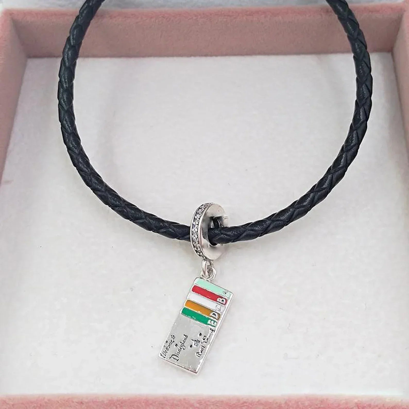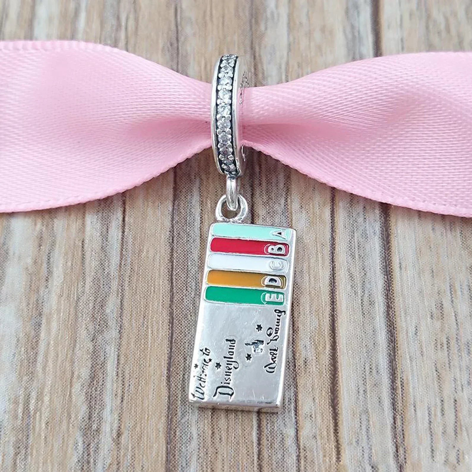 O ingresso vintage da Disneyland está pendurado em um fardo brilhante com pedras de zircônia cúbica transparente. O esmalte nas cores verde, amarelo, branco, vermelho e menta destaca os diferentes ingressos para cada atração no livro de cupons.