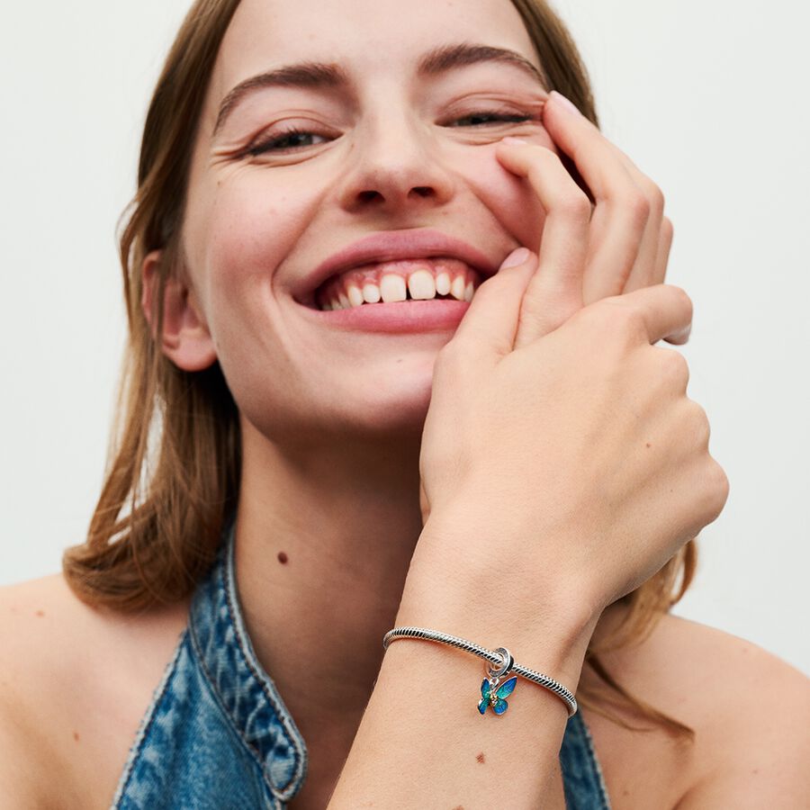 Ano novo, mantra novo. O Charm Borboleta é inspirado em um símbolo de beleza, força e transformação: a borboleta. Este charme de borboleta prateada apresenta asas móveis com esmalte azul transparente de dois tons revelando padrões intrincados por baixo. As costas das asas estão gravadas com a mensagem "Believe you can." "Acredite que você pode". No centro da borboleta está um conjunto de coração banhado a ouro de 14k com um diamante cintilante cultivado em laboratório, e a fiança gravada com o ano de 2024.
