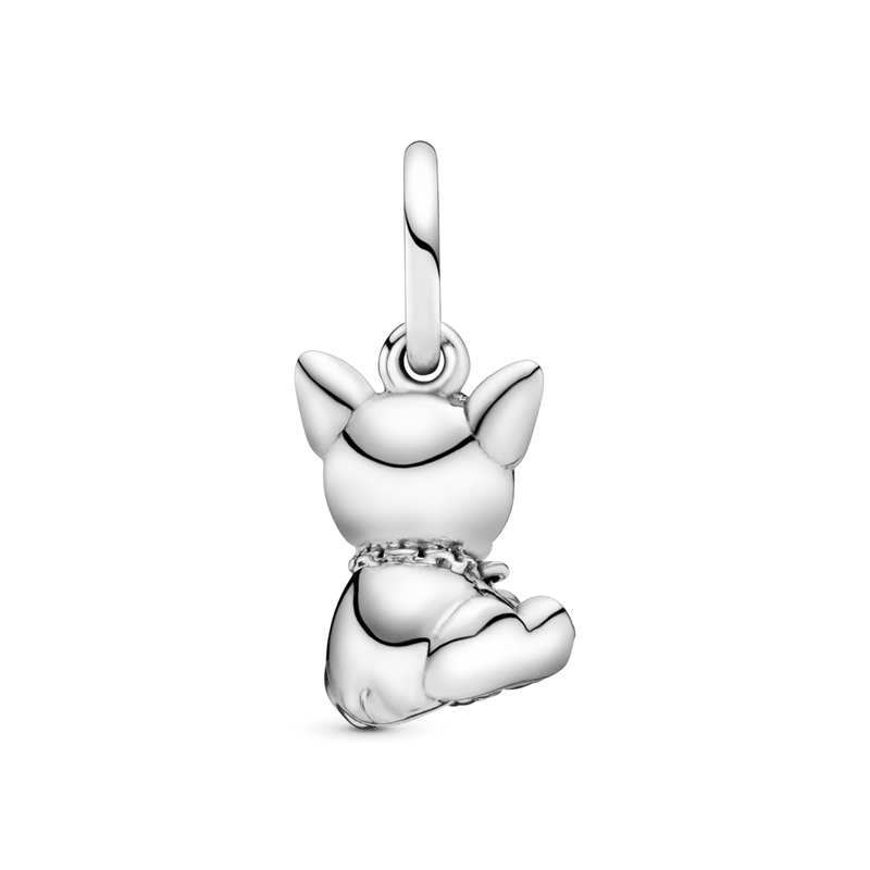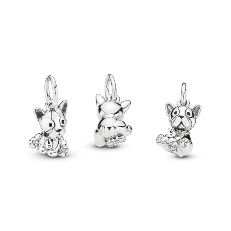 Coloque este filhote no centro do seu estilo: este charme de buldogue francês em prata de lei é detalhado com características adoráveis que incluem um colar e patas embelezados com coração pendurado.