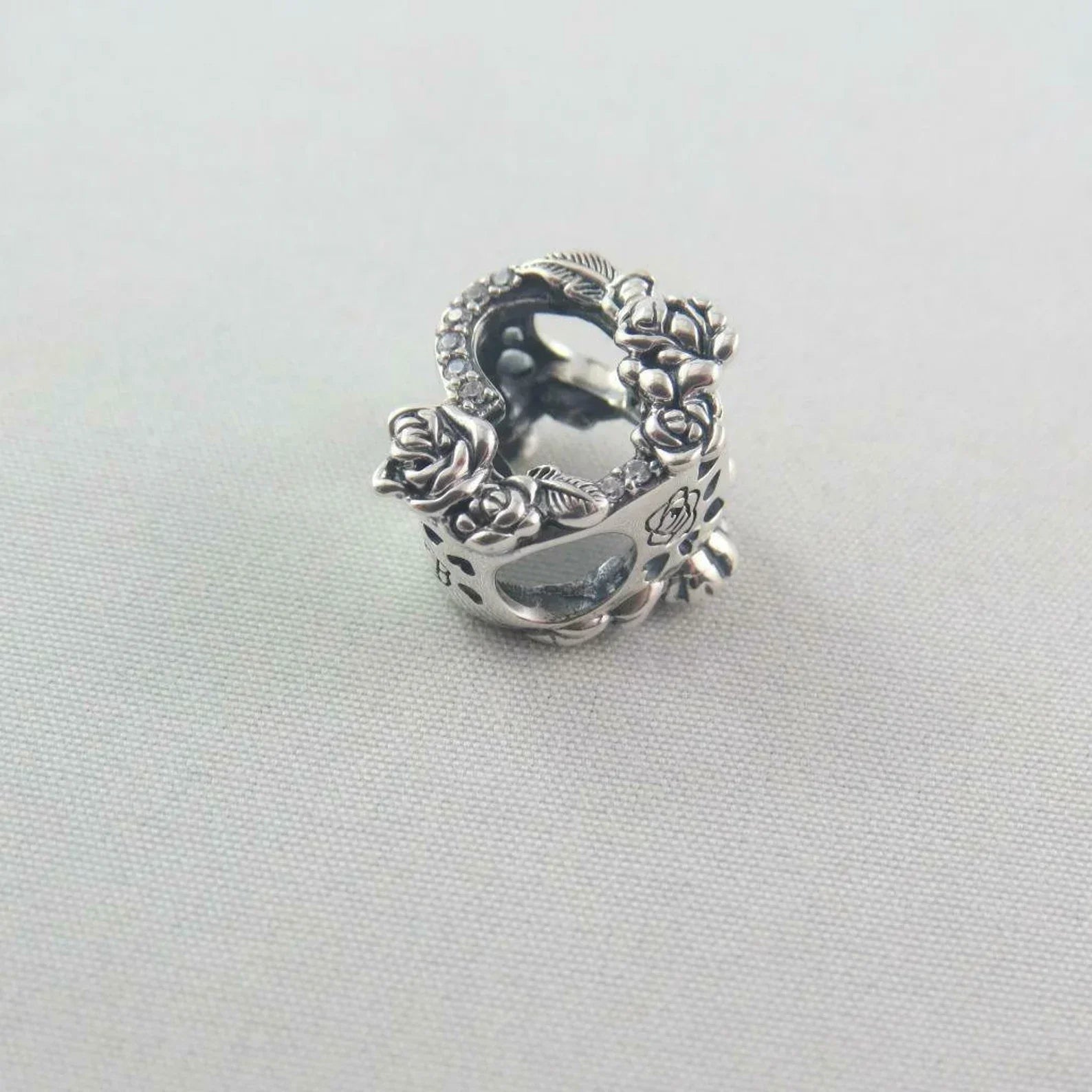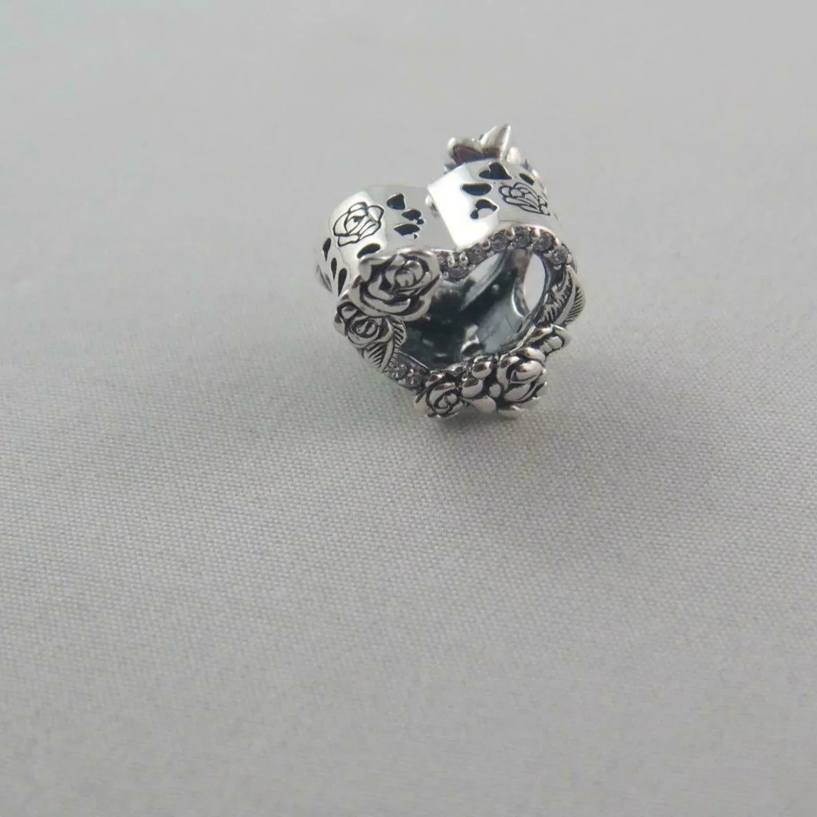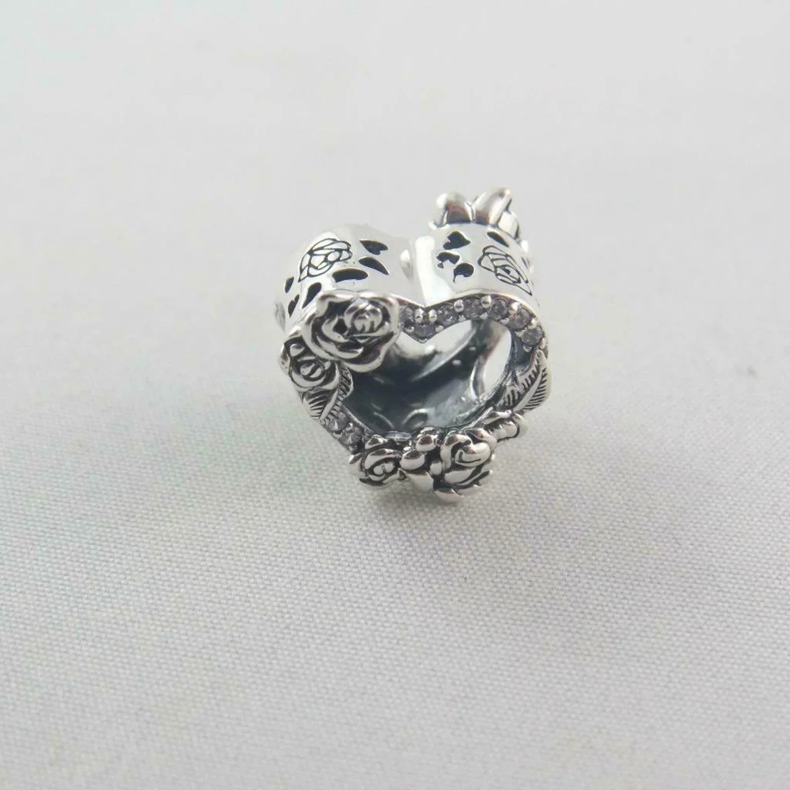 Expresse seus verdadeiros sentimentos com o Charm Coração Aberto E Rosas. Com acabamento à mão em prata de lei, este design de coração aberto apresenta detalhes intrincados. As armações frontal e traseira em forma de coração são embelezadas com detalhes decorativos de folhas e flores rosas e pedras claras para brilho adicionado. Os lados da peça incluem gravuras de rosas, bem como recortes de pétalas e corações. Inspirado na história de amor épica de Romeu e Julieta, presenteie alguém especial com este design atemporal.