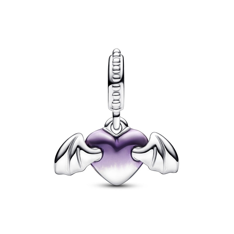 Marque o fator susto e entre no espírito do seu feriado favorito com nosso Charm Coração Vampiro Alado. Este charme divertido é decorado com esmalte transparente sombreado, que cria um gradiente de prata a roxo em todo o coração. Asas de prata 925 polidas com detalhamento que adicionam um elemento assustador ao design, juntamente com um sorriso gravado com presas na frente do charme.