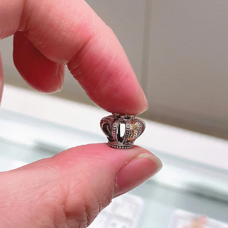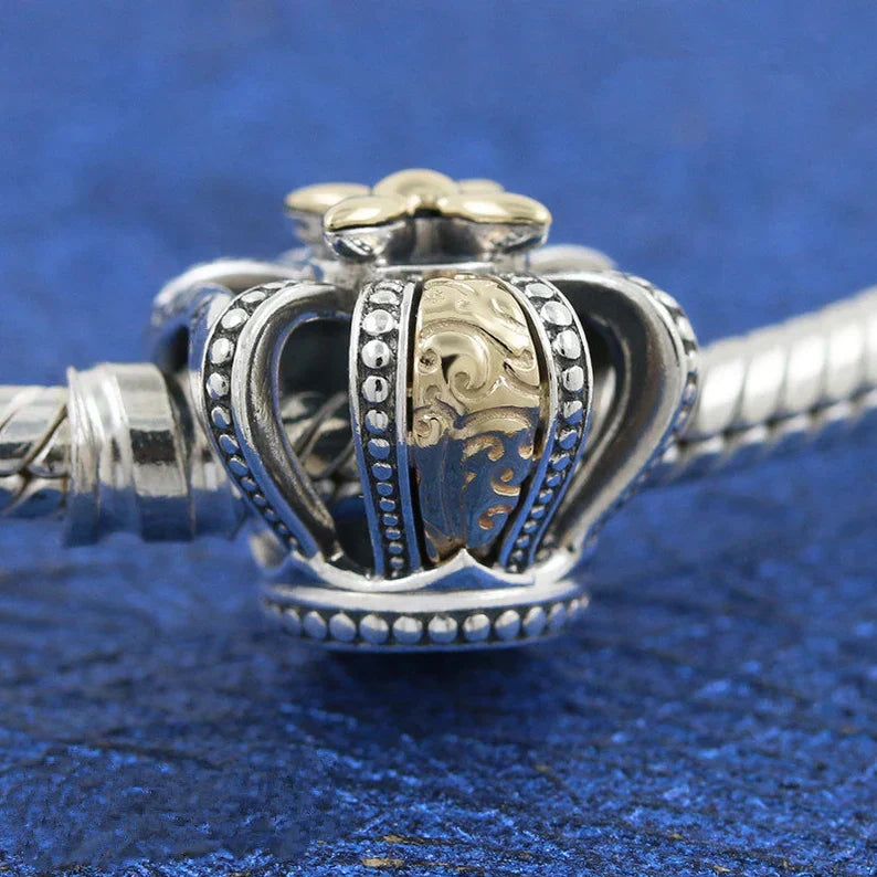 Acessórios como um real com o Charm Dois Tons Coroa Real. Com acabamento manual em prata 925 e ouro 14k, este charme apresenta uma coroa 3D de quatro lados com uma flor em forma de marquesa de ouro de 14k por cima e dois lados dourados de 14k com detalhes giratórios e um padrão floral. Micro contas ao longo das bordas e um disco de selo de marca dourada na parte inferior torna este intrincado e ornamentado charme da coroa ainda mais atraente.