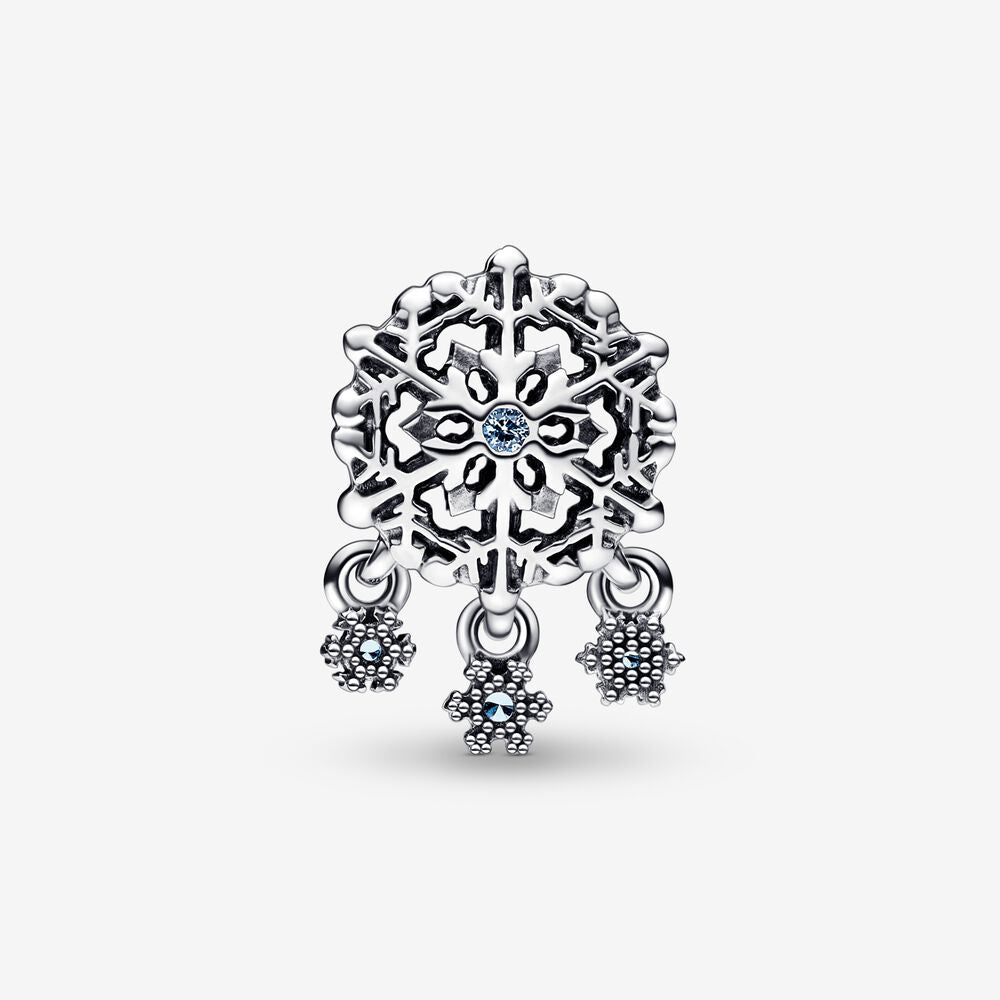 Uma celebração da beleza e singularidade da natureza, este Charm Gota de Floco de Neve Gelado com acabamento à mão apresenta um intrincado floco de neve recortado em prata esterlina, definido com um cristal azul pálido e pálido feito pelo homem em cada rosto e com detalhes de flocos de neve recortados ao redor das laterais do charme. Três flocos de neve menores balançam do charme, trazendo uma sensação de movimento que lembra flocos de neve girando no ar gelado - cada balança é sutilmente diferente e contém um cristal feito pelo homem. Use-o em seu estilo de joias inspirado no inverno como um lembrete para celebrar o que torna cada um de nós único.