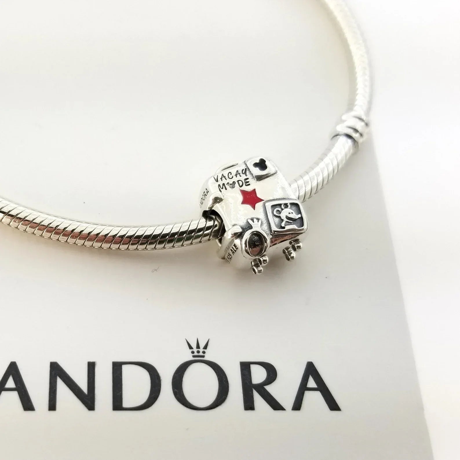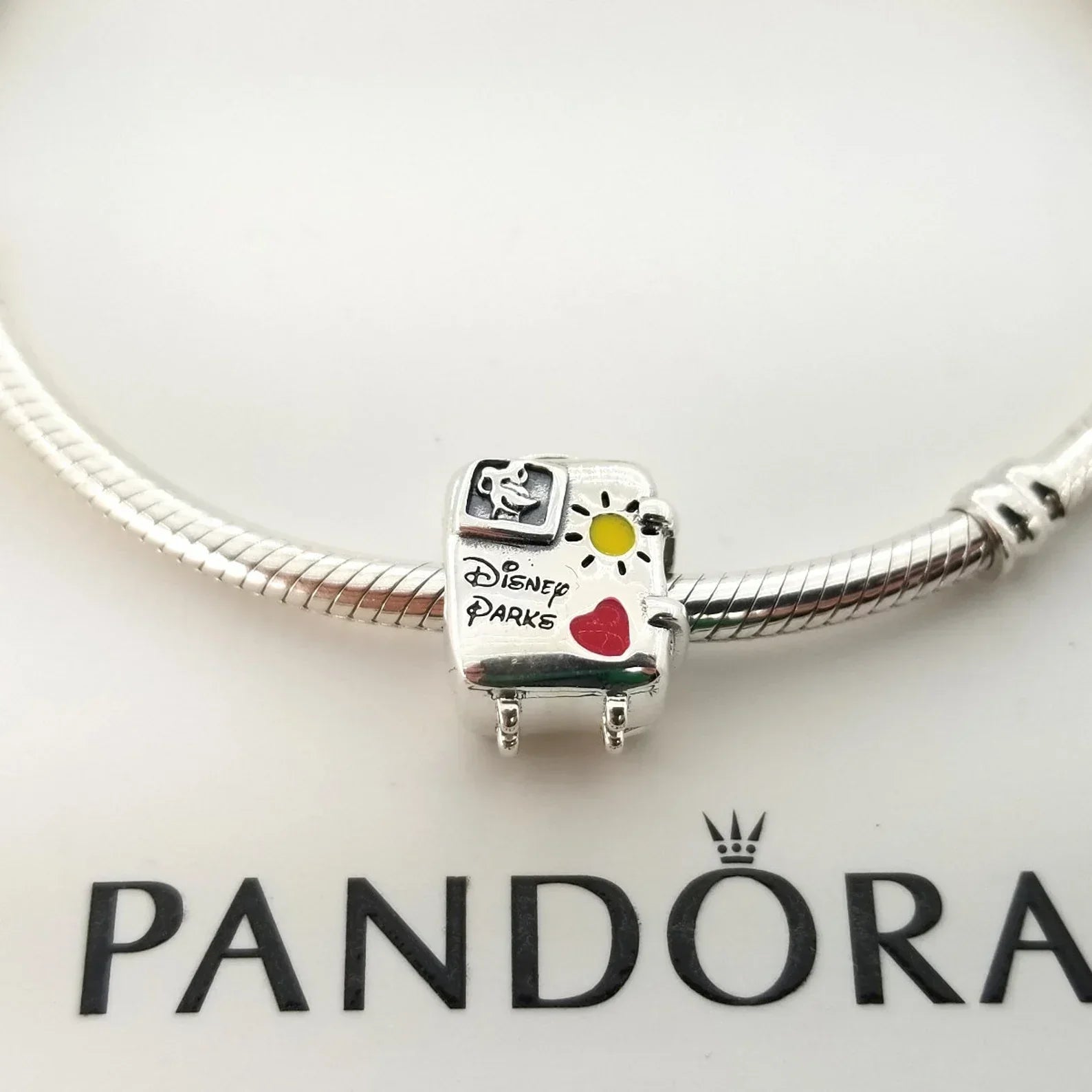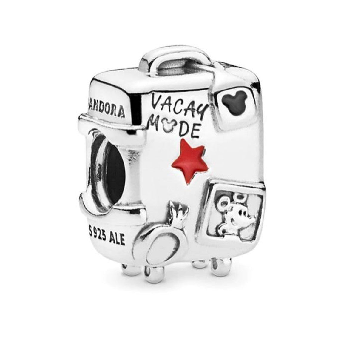 Adicione magia à sua pulseira para comemorar as viagens e aventuras da Disneylândia ao redor do mundo. A caixa prateada é gravada com "modo Vacay" .