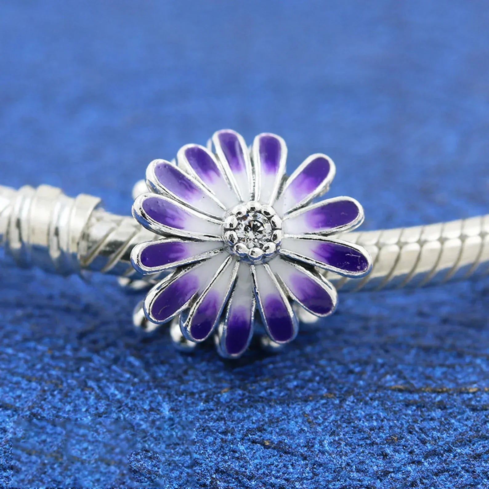 Use uma flor que dura para sempre com o Charm Flor Margarida Roxa. Este charm de flores apresenta duas flores de margarida em forma convexa com centros de pedra de zircônia cúbica cintilante cercada por micro contas e pétalas pintadas com esmalte sombreado lavanda aplicado à mão, roxo e branco. Inspirado pela ideia de que cada flor é única, esta peça de prata de lei representa a primavera, a diversidade e a comunidade. Deixe-o tornar cada dia, roupa e ocasião um pouco mais alegres.