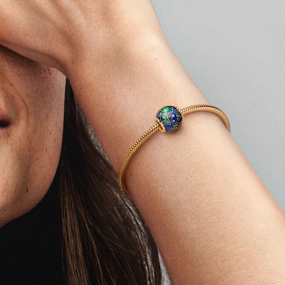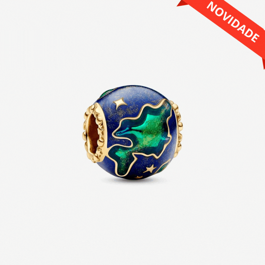 Celebre a beleza do planeta que chamamos de lar com o Charm Planeta Terra. Este charme esférico apresenta um acabamento quente banhado a ouro 14k e esmalte aplicado à mão em tons profundos de azul, verde e dourado cintilante, representando uma visão mágica do planeta Terra vista à noite. Cada continente é delineado em metal e o charme é detalhado com estrelas assimétricas elevadas para aumentar a beleza celeste da Terra vista de cima. Uma fileira de microesferas e estrelas elevadas cria uma borda ao redor de cada lado da abertura do encanto. Adicione-o ao seu estilo de joalheria para um toque cósmico.