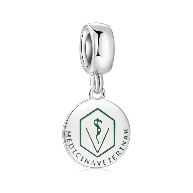 Mostre seu amor pela Medicina Veterinária que existe em você com os chamrs Profissões. Feito em prata 925, nossos charms tem 2 opções de modelo um charm pendente com o simbolo de sua profissão e uma versão globo, para usar na sua pulseira favorita.