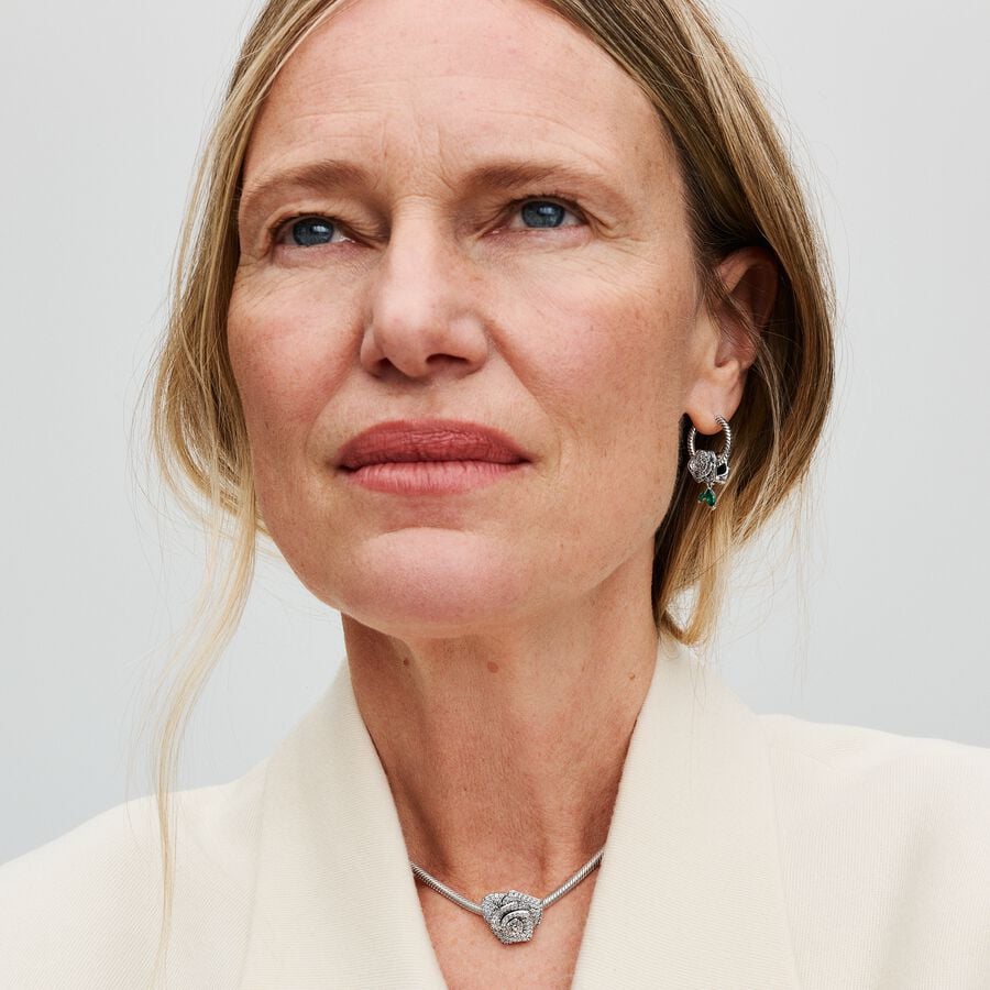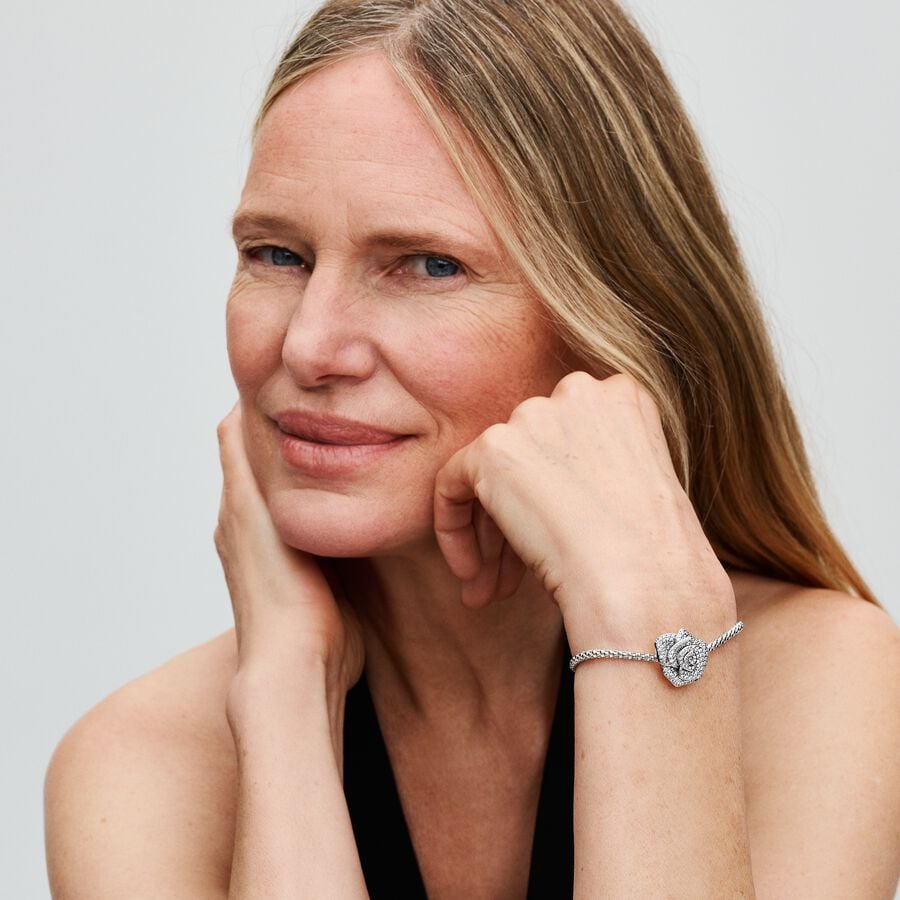 Traga o brilho com o nosso Charm Rosa Espumante em Flor . Esta peça atraente apresenta um intrincado motivo rosa oversized com camadas assimétricas, adornado com zircônia cúbica transparente de 38 micro e 149 contas para um efeito deslumbrante. O charme prateado possui orifícios funcionais sob cada pétala, bem como duas aberturas em forma de haste na parte de trás, que permitem que uma corrente passe delicadamente. Maior do que outros encantos com 20 mm de diâmetro, ele aprimora perfeitamente pulseiras e colares. Abrace o símbolo atemporal do amor com este requintado charme de rosa.