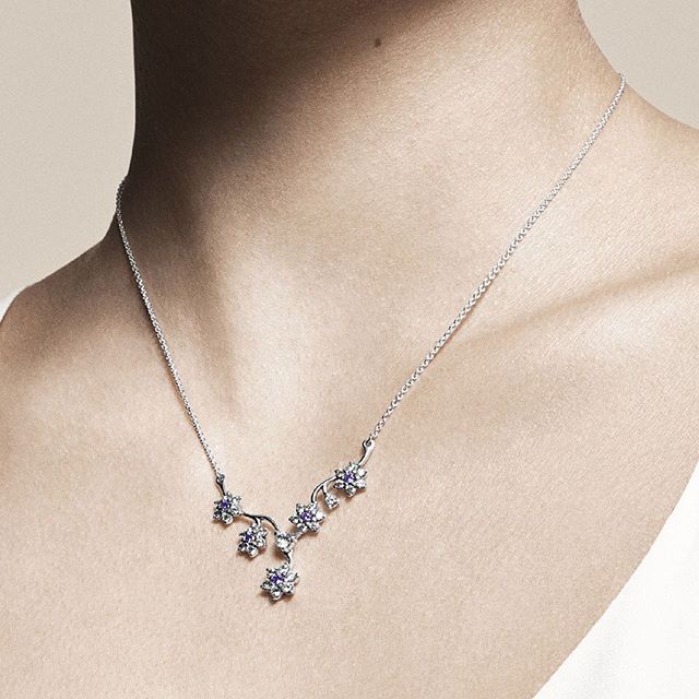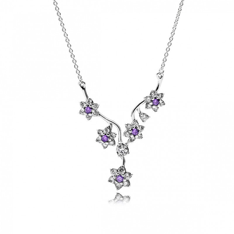 Pequeninas flores miosótis em hastes torcidas dão um visual simbólico e delicado a esse design de colar. Criado para decores baixos, ele será um belo destaque e o toque final em qualquer roupa.