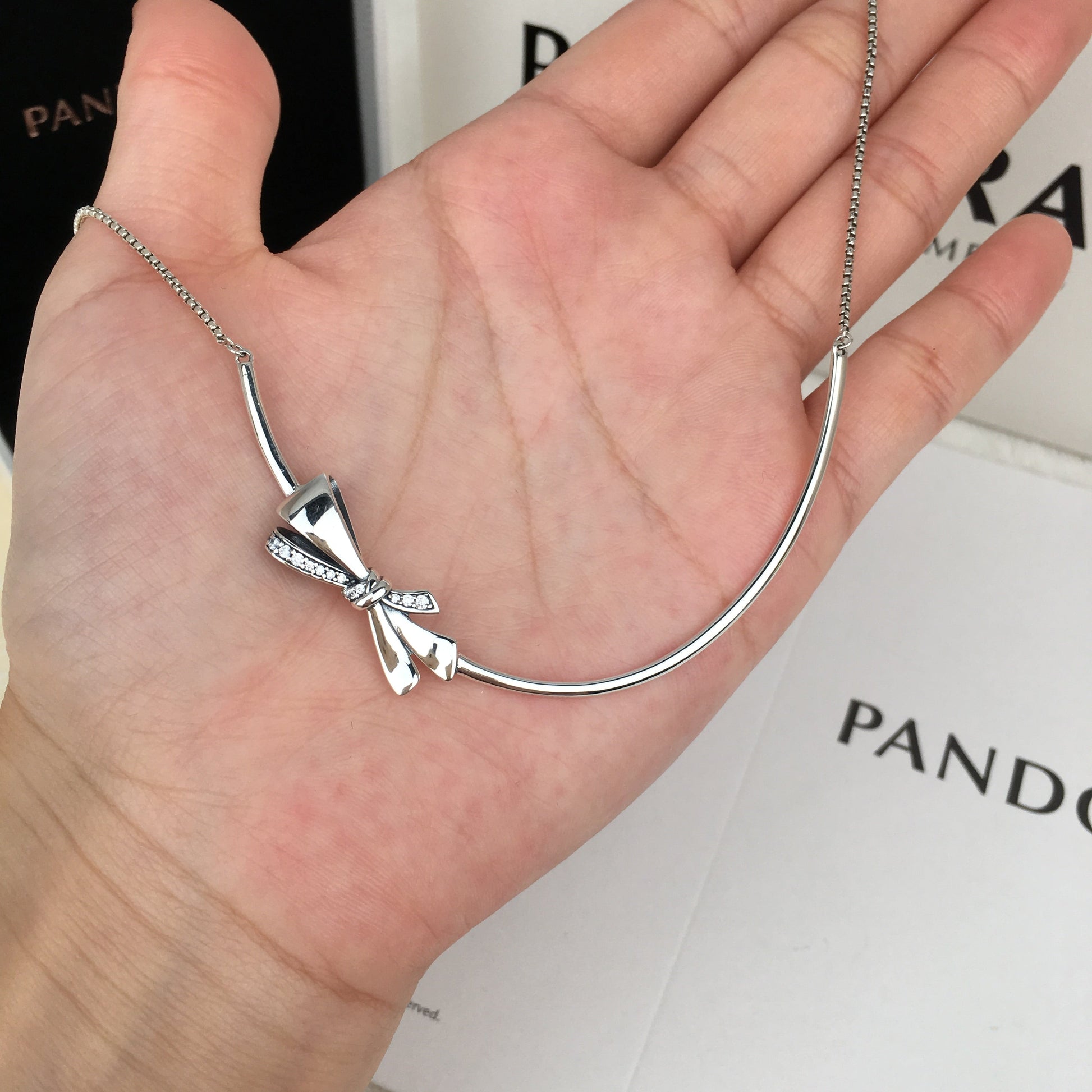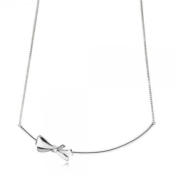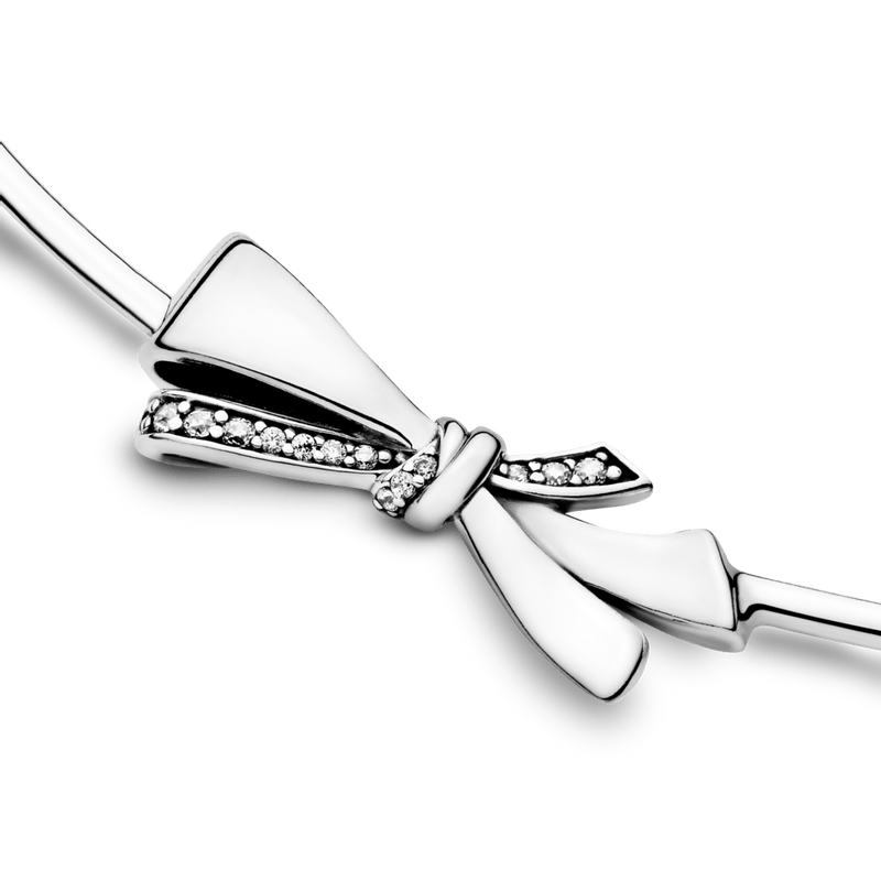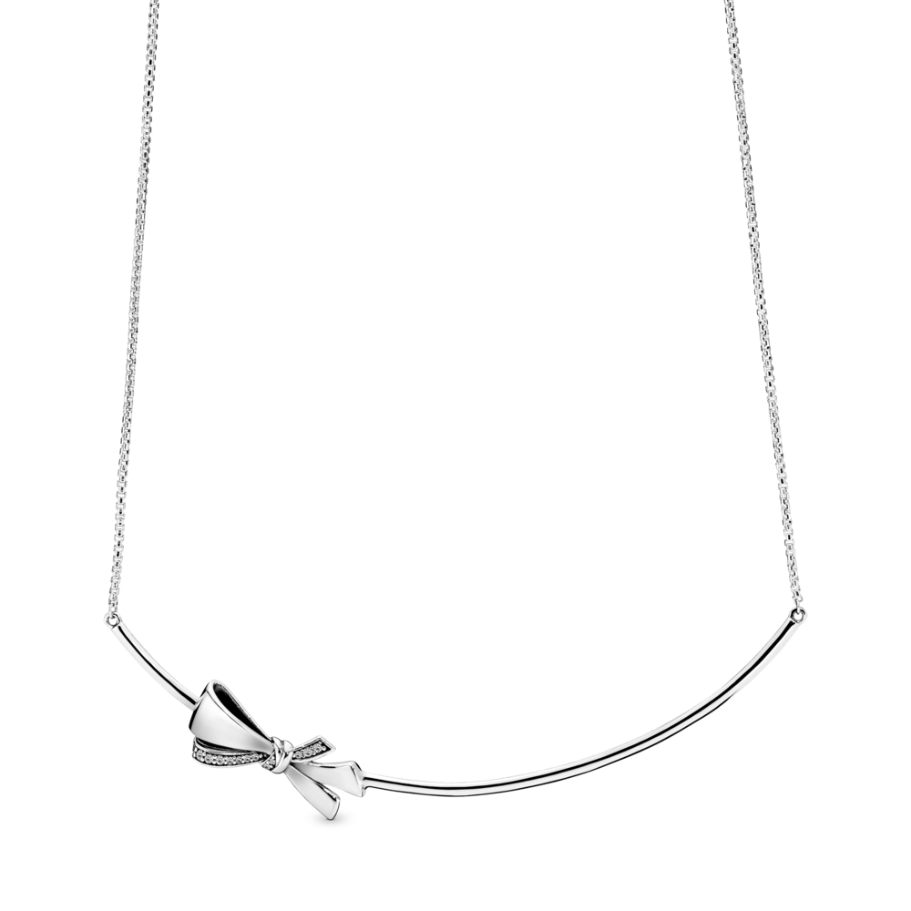 Em um aceno ao glamour retrô, este colar de prata 925 funde uma corrente delicada com um aro tubular e é coberto com um detalhe de laço chique com detalhes em pedra.
