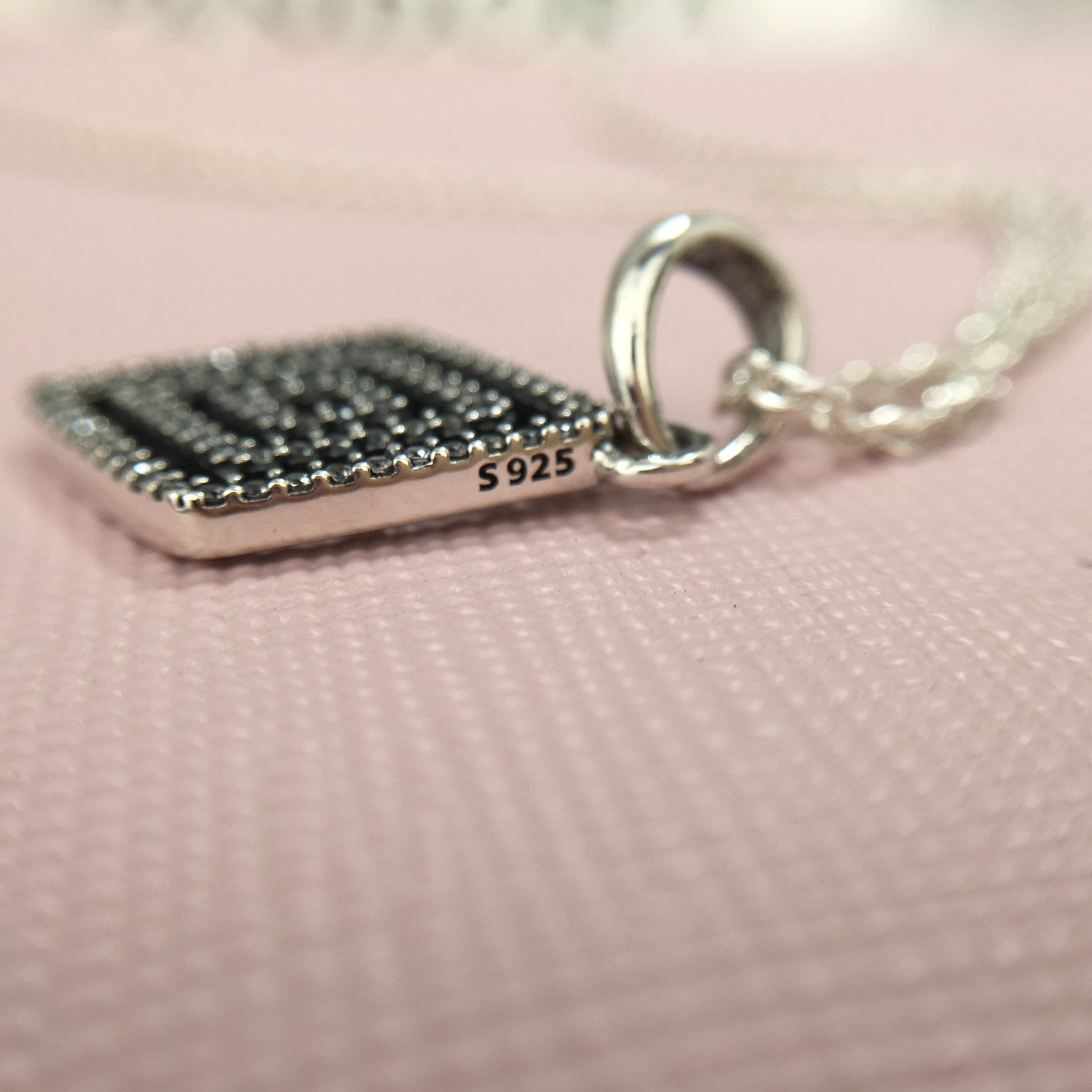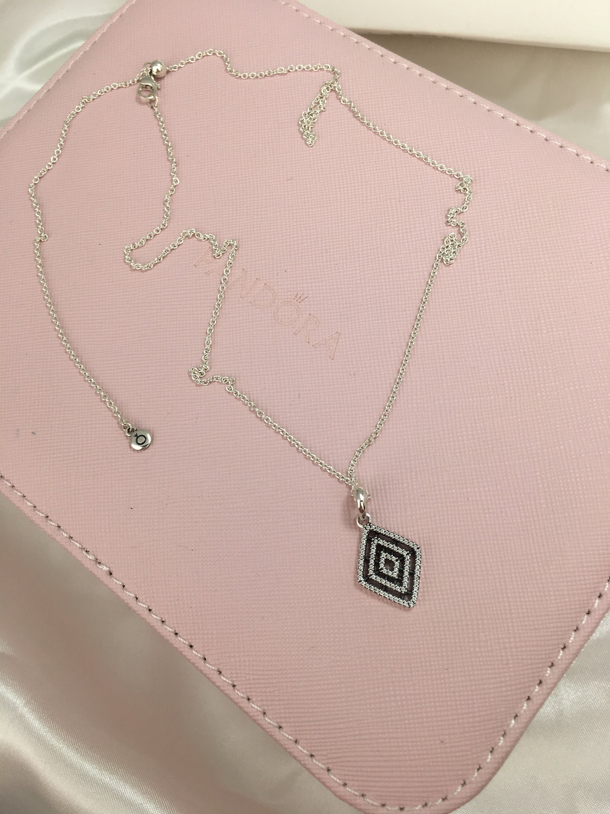 Com muita simetria, linhas decoradas com pedras acrescentam dimensões envolventes de geometria a este colar em prata 925. Um fecho deslizante ajustável torna esta joia versátil e chique ao mesmo tempo. Pendente em prata de lei com 78 microzircônias cúbicas transparentes com cravação em contas e colar de 60 cm com fecho deslizante.