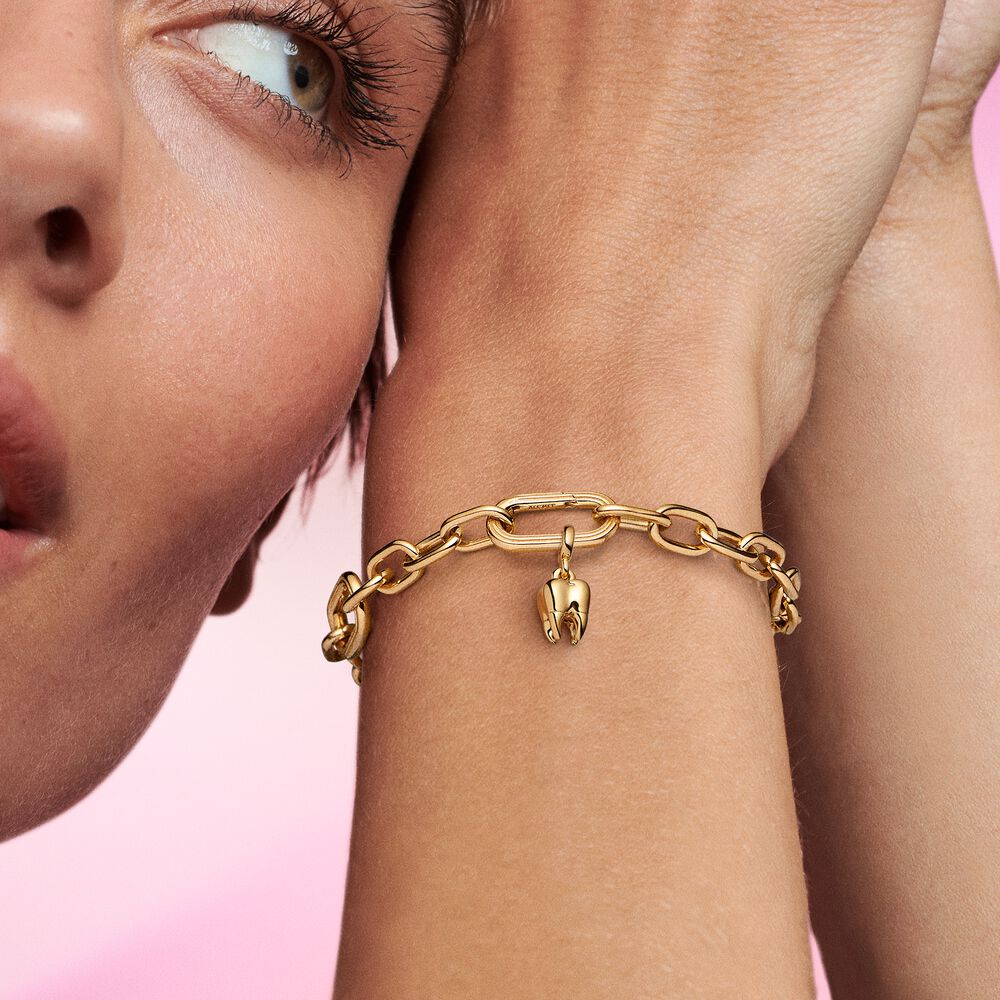 Morda em novas possiblidades de estilo com nosso Mini Charm Dente. Com acabamento manual com revestimento de ouro 14k, esta peça inspirada em Y2K apresenta um design de dente realista com a palavra 'ME' estampada em esmalte preto. O mini charm pode ser estilizado em conectores de estilo abertos através de pulseiras de corrente de link, colares, anéis e aros. Use-o com suas joias favoritas e adicione uma borda instantânea ao seu visual.