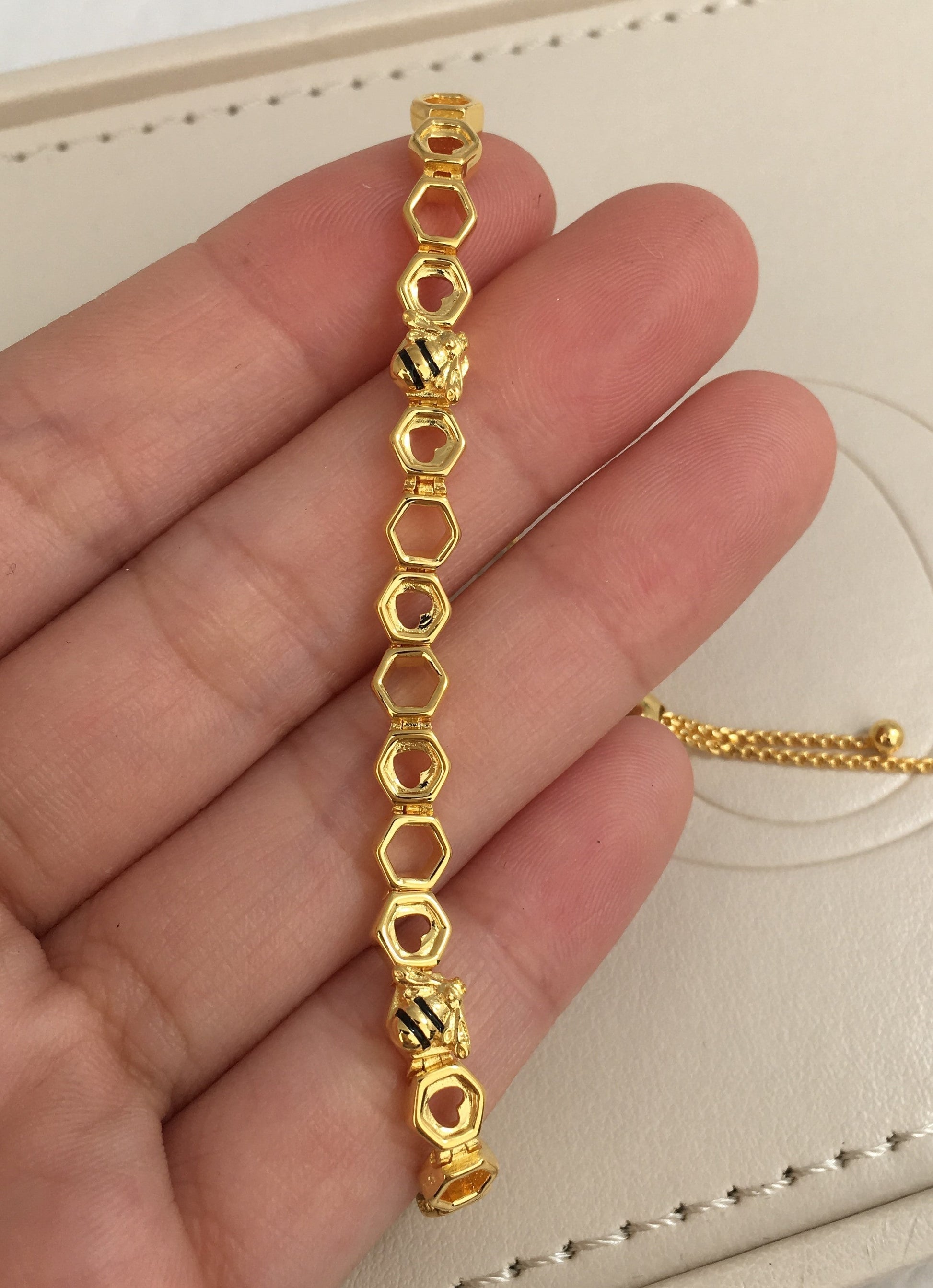 Enfeite seu pulso com formatos de colmeia com esta Pulseira Abelha Reluzente em prata 925 com banho em ouro 18k, com uma abelha em esmalte preto no topo. Ajuste-o para que fique perfeito em você. Pulseira Abelha Reluzente com esmalte preto e fecho regulável.