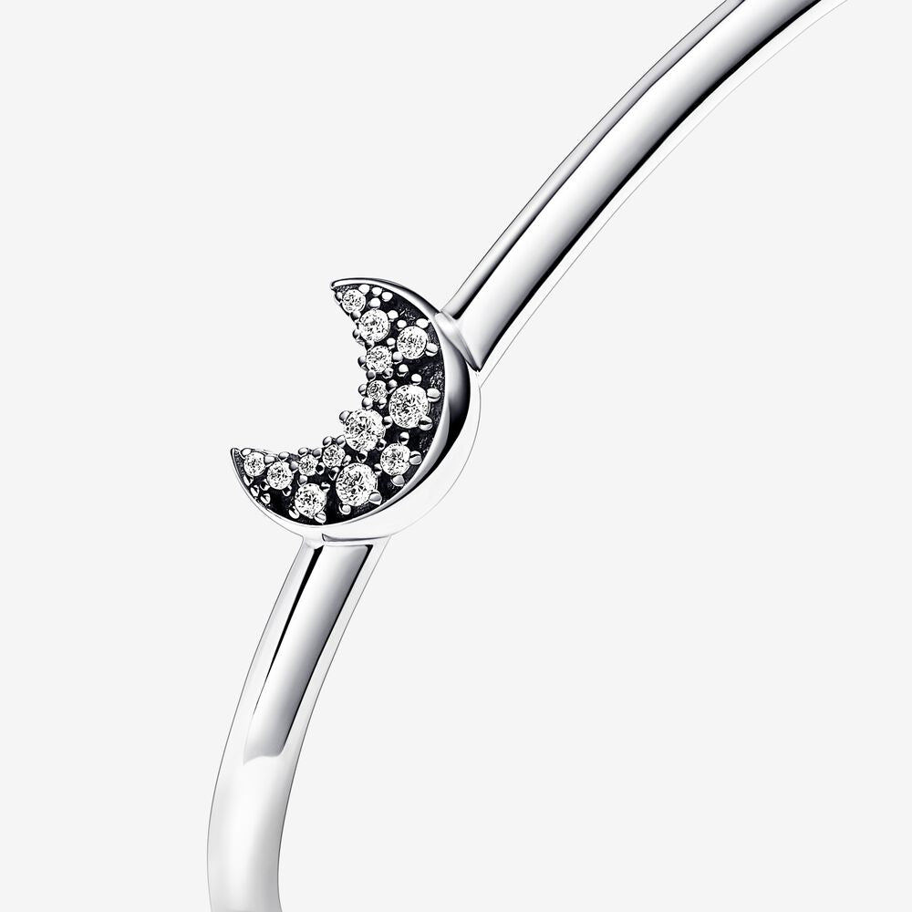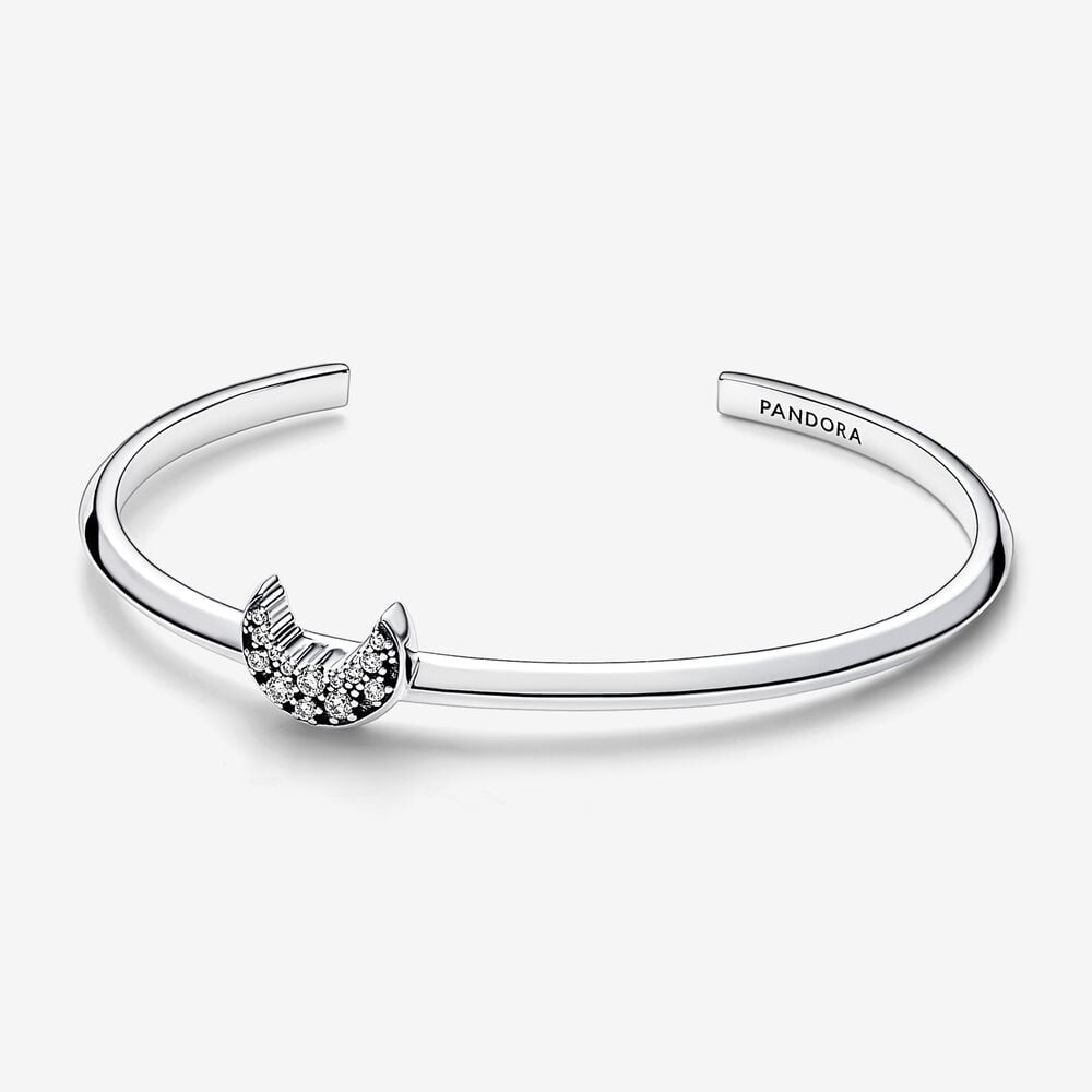 Celebre a magia do céu noturno com a nossa Pulseira Aberta Lua Crescente Brilhante. A pulseira de pulseira aberta em prata esterlina apresenta uma forma de prisma por toda parte, bem como uma lua ligeiramente assimétrica. A lua crescente é adornada com brilhos de tamanhos diferentes para maior brilho. Inspirado no Dia dos Namorados chinês, o design brilhante e intrincado da lua combina o romance místico do amor com o céu noturno mágico, tornando o presente perfeito para uma pessoa amada. A pulseira foi projetada para se encaixar perfeitamente no pulso e não precisa ser torcida ou flexionada para ser usada.