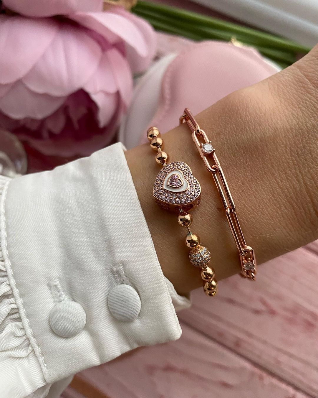 Para um toque de sofisticação, procure a Pulseira Link Chain & Stones. Este design clássico e volumoso é feito à mão em Rose (mistura única de metal banhado a ouro rosa 14k). Apresentando zircônia cúbica transparente em três dos elos da pulseira para maior brilho, esta peça de pulso inclui uma etiqueta pendurada no elo de fechamento. Use com outros estilos de corrente de elos para um visual elegante com uma borda.