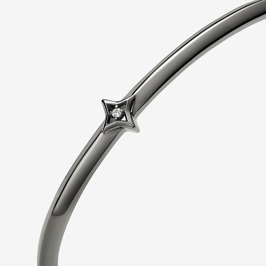 Coloque a Pulseira de Aberta Estrela Brilhante e sinta a beleza do céu noturno. A pulseira de laço aberto é feita de rutênio banhado com um brilho preto claro e linhas angulares para mostrar uma personalidade única, e uma estrela de quatro pontas adorna um lado para um efeito assimétrico. Uma pedra preciosa é colocada no meio das estrelas para realçar o brilho do design. Inspirado no romântico Dia dos Namorados Qixi, o design condensa o símbolo do amor e transforma a atmosfera misteriosa e romântica em uma estrela significativa, que é o trabalho perfeito para dar amor. A pulseira de laço aberto foi projetada para se encaixar perfeitamente no seu pulso e usar facilmente.