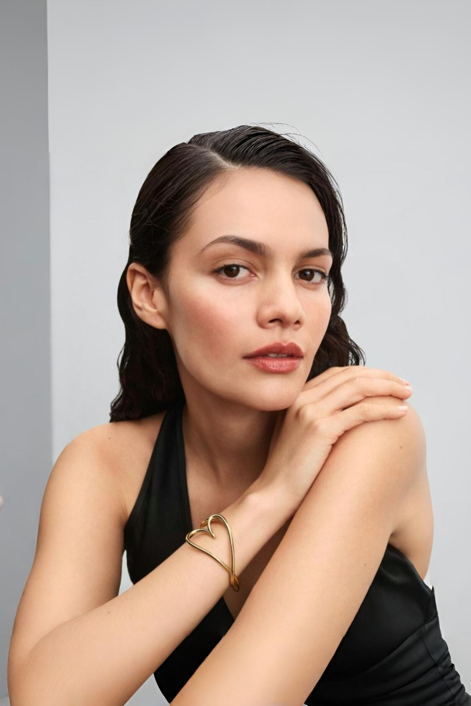 Uma peça escultural. O metal banhado a ouro 14k flui em uma linha contínua ao redor do pulso, formando uma pulseira aberta com um motivo de coração de grandes dimensões. Combine-o com os brincos e o anel correspondentes para uma abordagem moderna de um símbolo duradouro de amor.