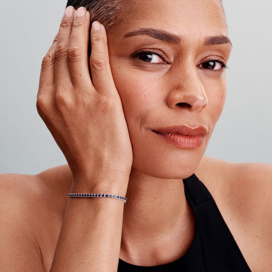 Nossa pulseira de tênis clássica reimaginada é feita de prata esterlina e apresenta uma fileira cintilante de 34 cristais redondos de corte brilhante em azul royal feitos pelo homem. Projetado com camadas em mente, esta é a peça definitiva para adicionar escala e profundidade às suas pilhas com seu tamanho de pedra maior. Use o seu como uma declaração cintilante durante toda a temporada e além, ou embrulhe-o como uma surpresa brilhante para quem você ama.
