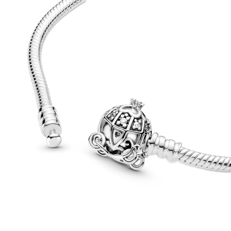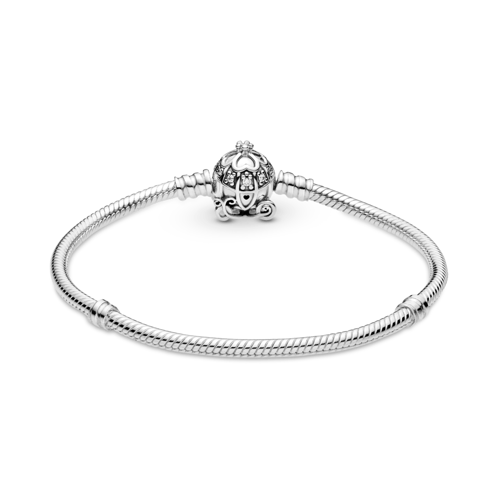 Faça um desejo com o bracelete com fecho de carruagem da cinderela. Celebre o 70º aniversário da cinderela com este anel finalizado à mão em prata de lei. esta peça ostenta uma carruagem de abóbora com pedras cravejadas representando as janelas, quatro corações que formam um trevo e uma coroa 3d na parte superior, um coração gravado no lugar da maçaneta e rodas de abóbora. conecte seus charms favoritos a este bracelete para obter um efeito mágico.