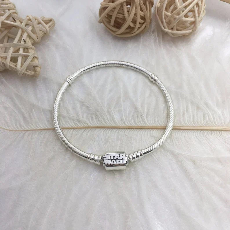 Sonhe com uma galáxia muito, muito distante com a pulseira Star Wars. Com acabamento à mão em prata esterlina, esta icônica pulseira é obrigatória para os verdadeiros fãs de Star Wars. O fecho em forma de barril apresenta o logotipo icônico Star Wars em ambos os lados. Prenda seus charms favoritos de Star Wars a esta pulseira para manter a Força próxima.