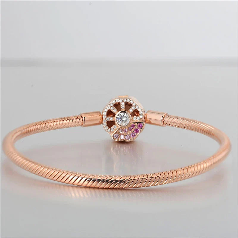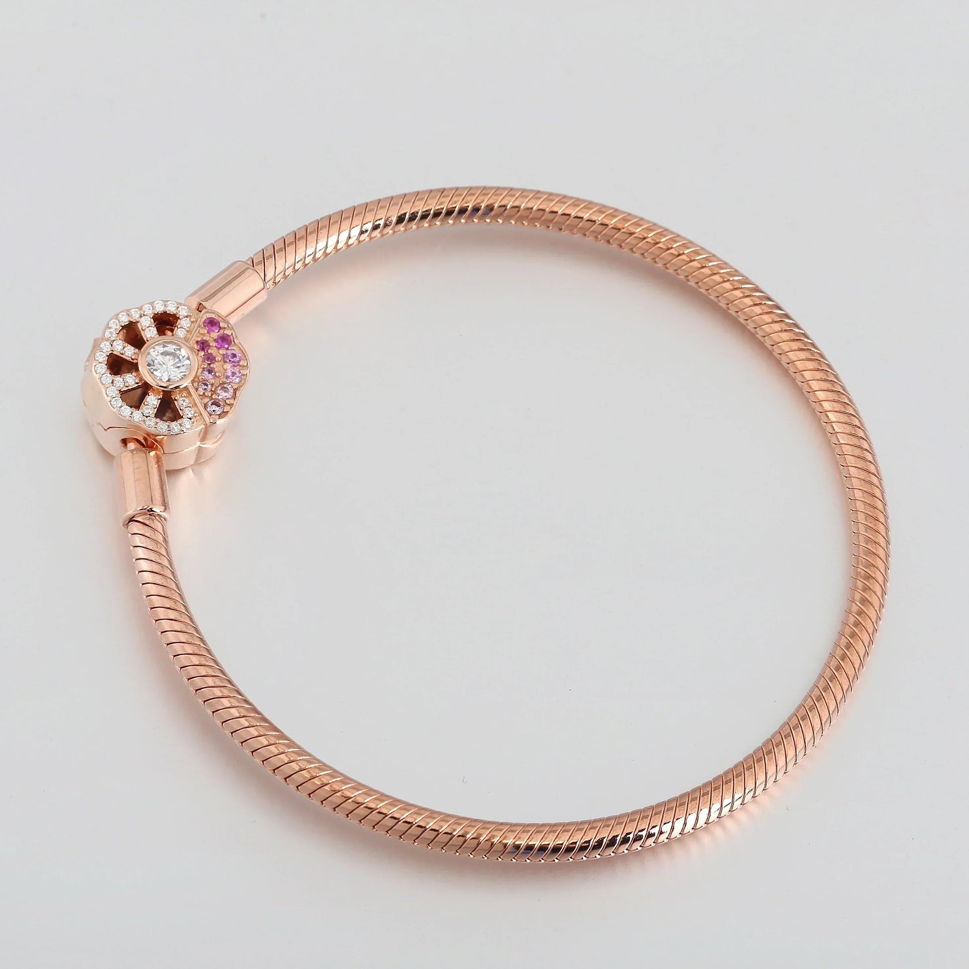 Faça uma declaração com esta Pulseira Leque Rosé exclusiva com um fecho inspirado em fã. Acabada à mão em Rose, nossa mistura exclusiva banhado a ouro rosa 14k, a pulseira apresenta um fecho com um design de leque aberto ombré cravejado de tons de safiras sintéticas rosa, rubis e zircônias cúbicas. O design da pulseira é inspirado no simbolismo dos fãs tradicionais do Extremo Oriente, significando poder, amor e status. Adicione seus berloques favoritos e use-os com outras peças inspiradas em fãs para completar o visual.