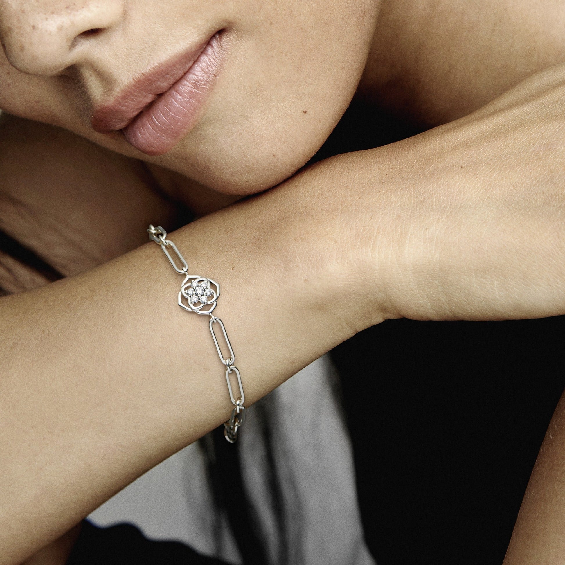 Pulseira em prata 925 em formato Link e fecho lagosta, detalhe em formato de rosa com zircônia.