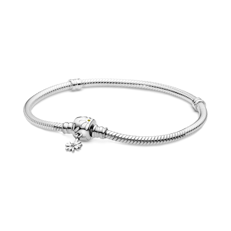 Adicione um pouco de flower power à sua pulseira de corrente entrelhaçada com o design de fecho de margarida. Inspire-se com a delicada mas poderosa flor da margarida, que simboliza a liberdade de ser quem você quer ser. Esta pulseira de corrente de cobra apresenta detalhes de margarida esmaltada branca no fecho, um pequeno pedaço de flor pendente, bem como cristais amarelos e zircônia cúbica transparente. Estilize com seus amuletos favoritos ou adicione amuletos de margarida para um efeito floral adicionado.