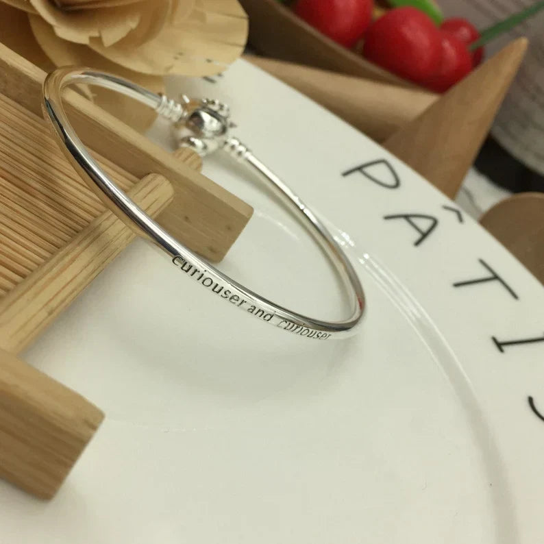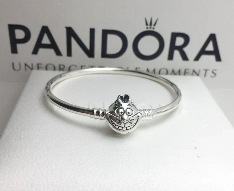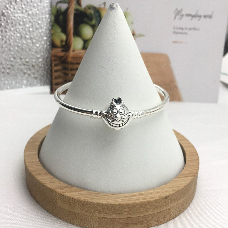 Fique curioso com a Pulseira Rigida Gato Risonho. Esta pulseira de prata esterlina apresenta um fecho em forma de rosto do gato de Cheshire, com linhas sulcadas para formar seu sorriso de assinatura e características faciais na frente, além de uma cauda levantada e logotipos da parte de trás. Threads emoldurando o fecho mantêm os encantos com o encadeamento seguro. Gravado com a famosa linha do filme, 'Curiouser and curiouser', este bracelete adicionará diversão extra ao seu visual.