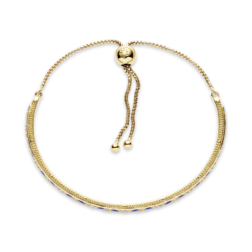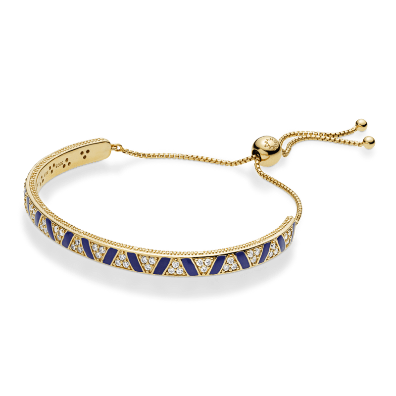 Deixe os tons azuis adicionarem sabor ao seu visual com esta pulseira deslizante, nossa mistura de metal única banhada a ouro 18k. A pulseira é perfeita para dar uma sensação de verão ao seu look e foi detalhada com esmalte azul aplicado à mão e pedras de zircônias cúbicas transparentes, inspiradas nas linhas dos triângulos. Ajuste o fecho para o ajuste perfeito. Junte várias camadas para criar uma pilha de pulseiras personalizada ou use sozinha com a roupa perfeita.