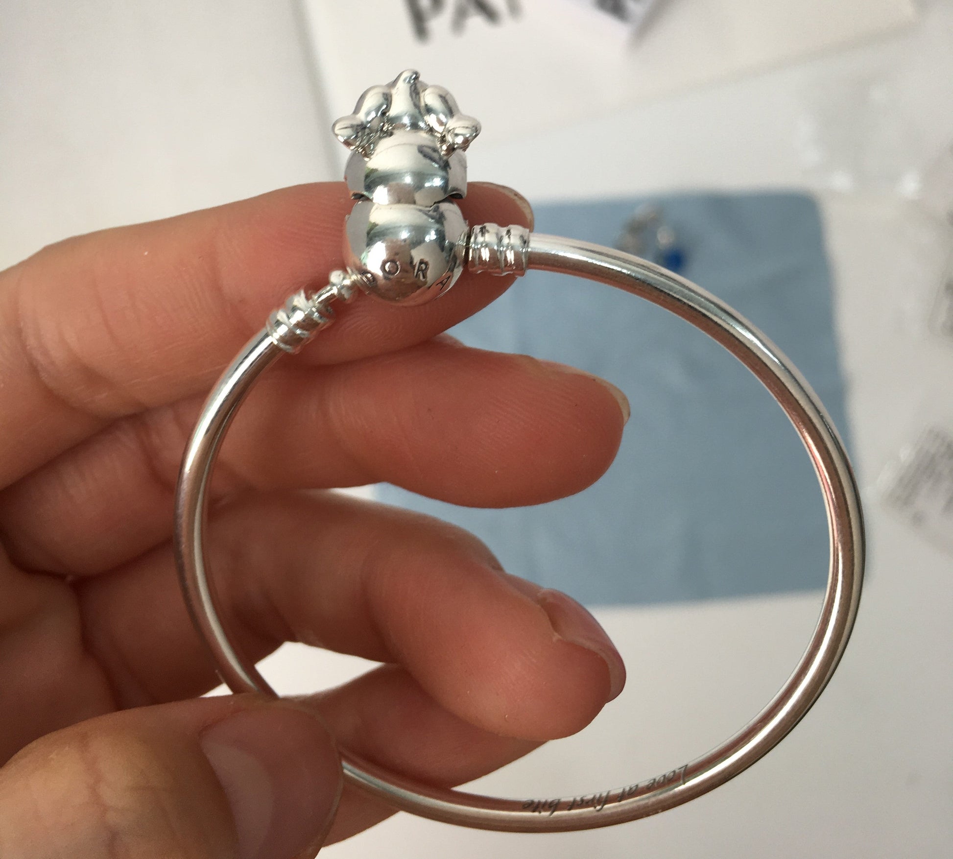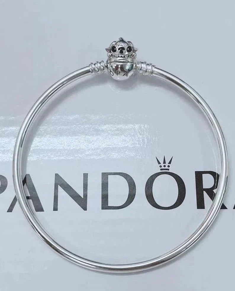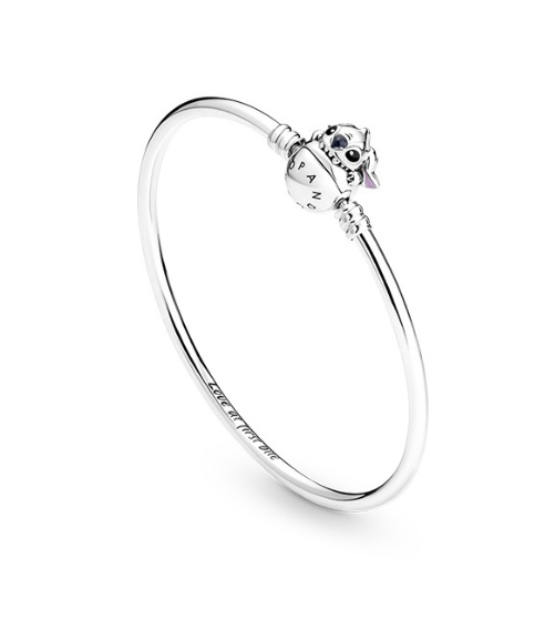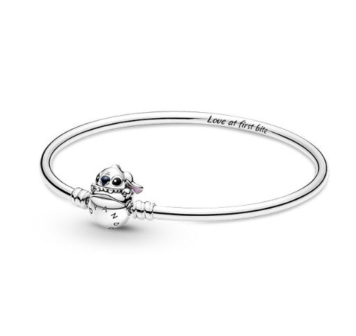 Este ano é o 20º aniversário de Lilo e Stitch. Como resultado, Stitch tem comemorado fazendo todo tipo de travessura, como dar uma grande mordida no clássico bracelete! A pulseira agora tem um toque com Stitch travesso pendurado no fecho de bola e tentando dar uma mordida enorme. Esmalte preto e lilás é pintado à mão em seus olhos, orelha e nariz, enquanto o interior da pulseira é gravado com a doce mensagem "Love At First Bite" “Amor à primeira mordida”. Use a pulseira sozinha ou estilizada com até 16-18 berloques, pingentes ou pingentes.