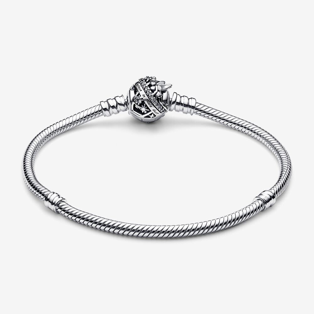 Torne cada dia mágico. O fecho redondo de trabalho aberto apresenta Sininho segurando uma fita de pavé cintilante, bem como a mensagem gravada "I believe in pixie dust"